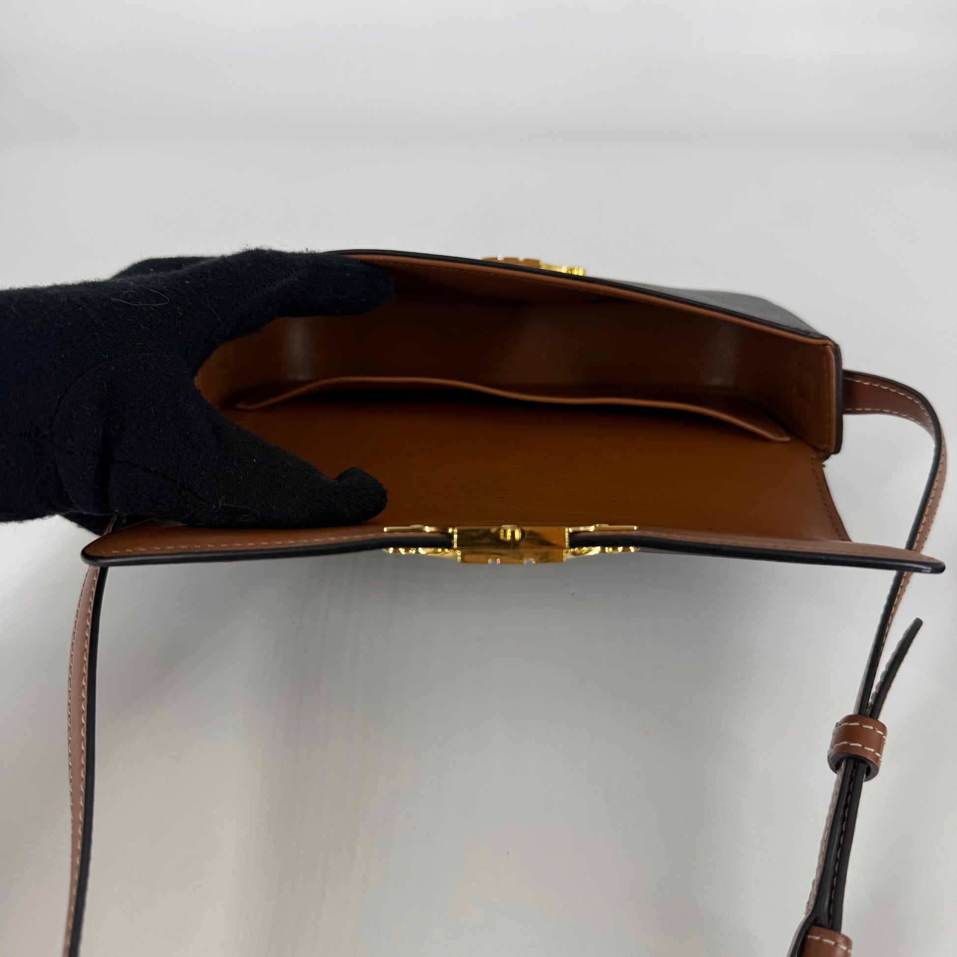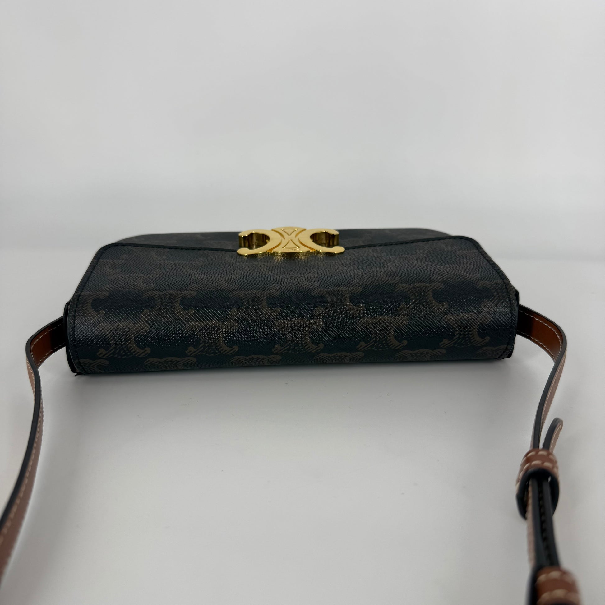 Hardware: Gold-tone Triomphe clasp is shiny and bright. The hardware is in excellent condition with only minor micro hairline scratches consistent with gentle use, nothing beyond normal. The clasp functions perfectly. The small leather keeper (strap loop) is intact and present.