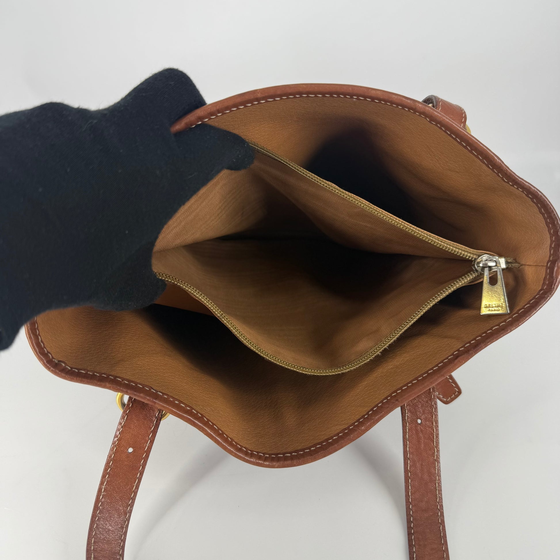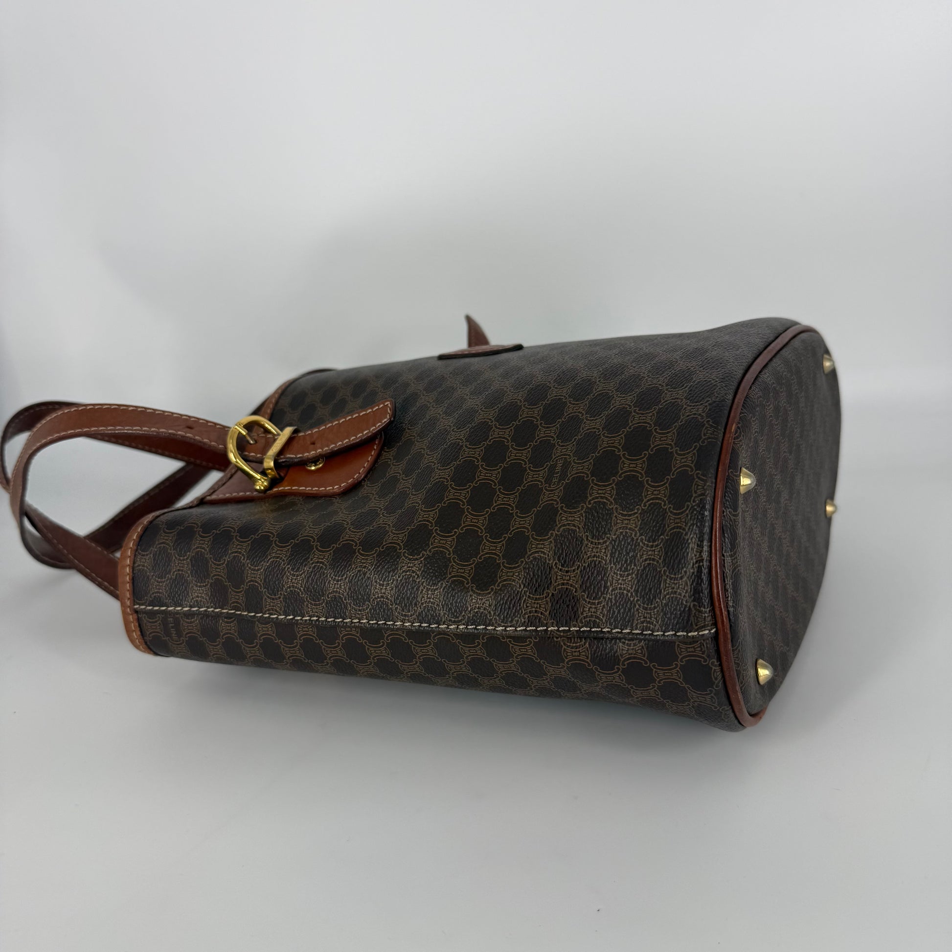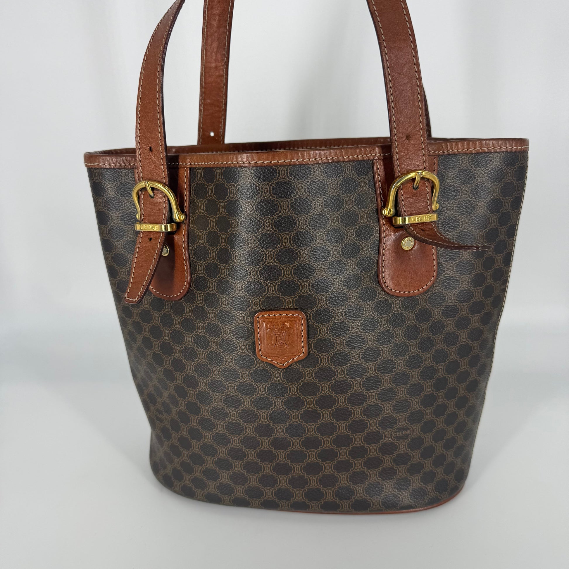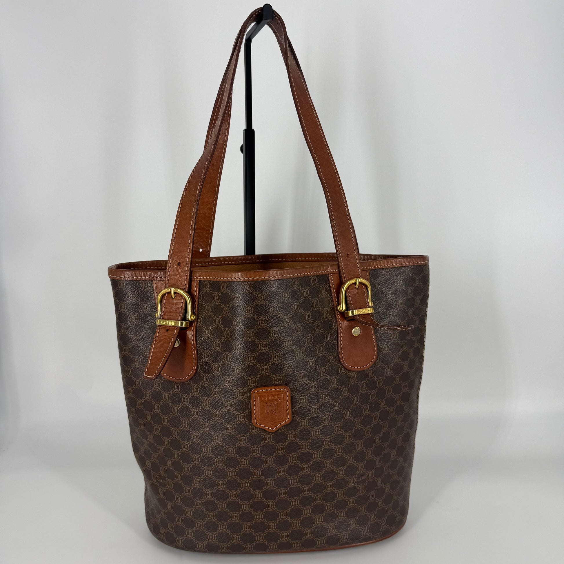 Exterior: Classic Céline Macadam coated canvas in good overall condition. No holes, no stains, no odors. Corners show very minimal signs of wear. Leather trim is intact with natural patina from age. Hardware shows tarnishing, and as visible in the photos, there is metal transfer staining on the leather beneath the buckles, a common characteristic of this vintage model due to its original construction and natural oxidation over time. This is purely cosmetic and does not affect structure or functionality.