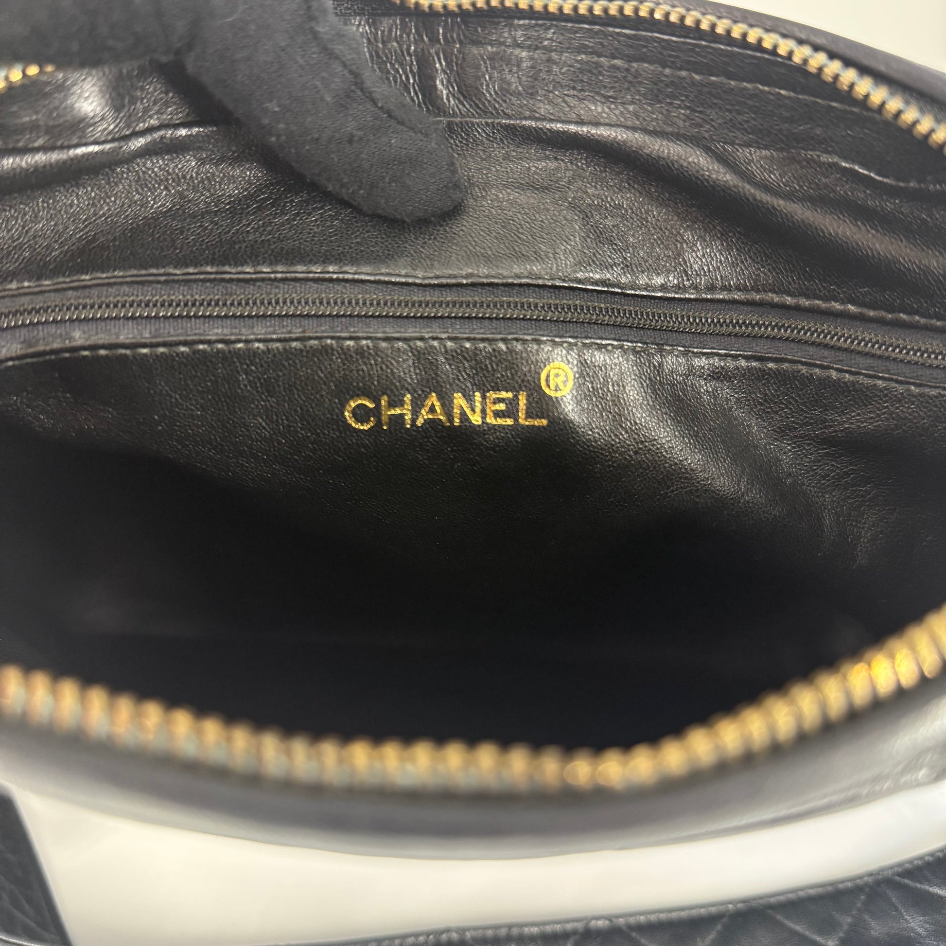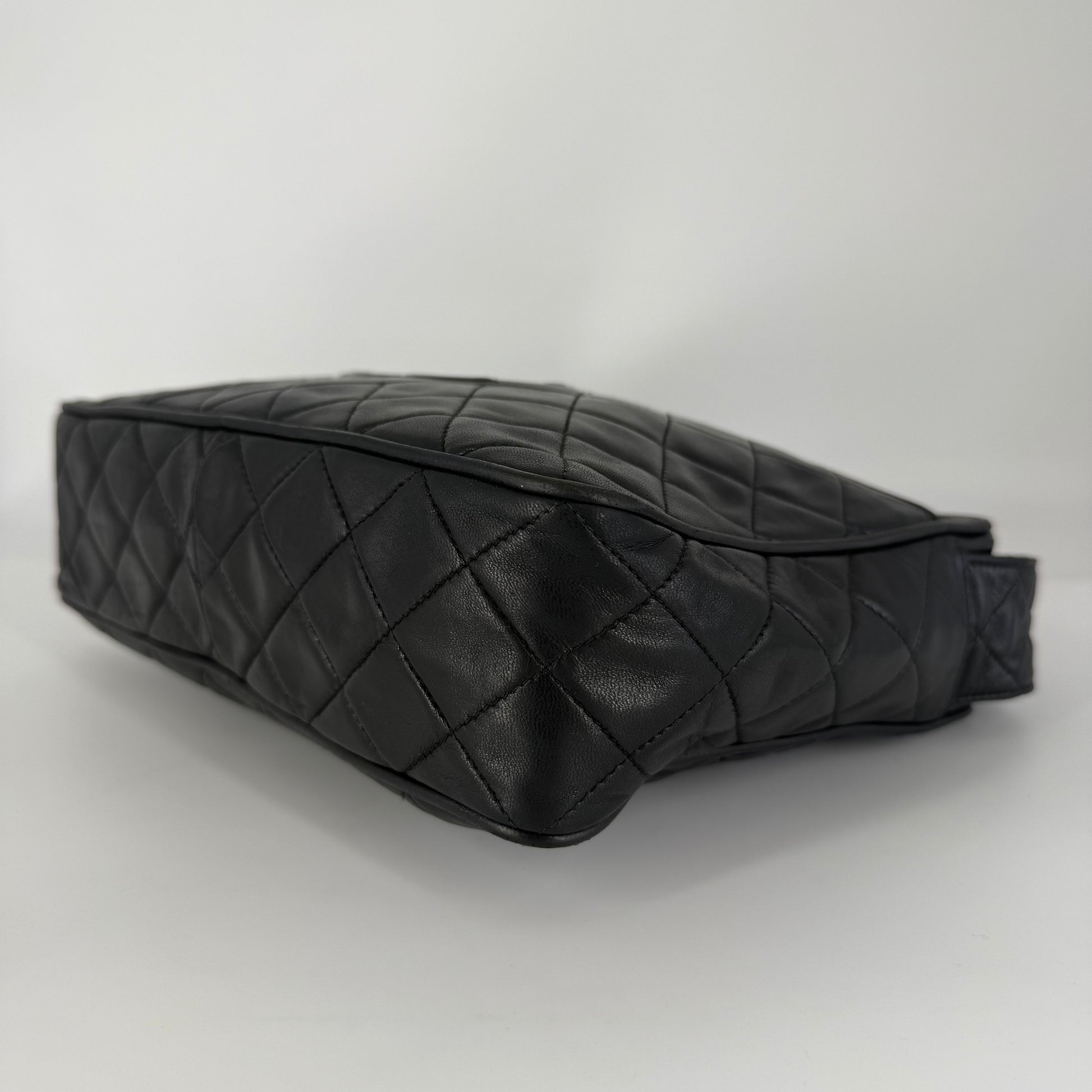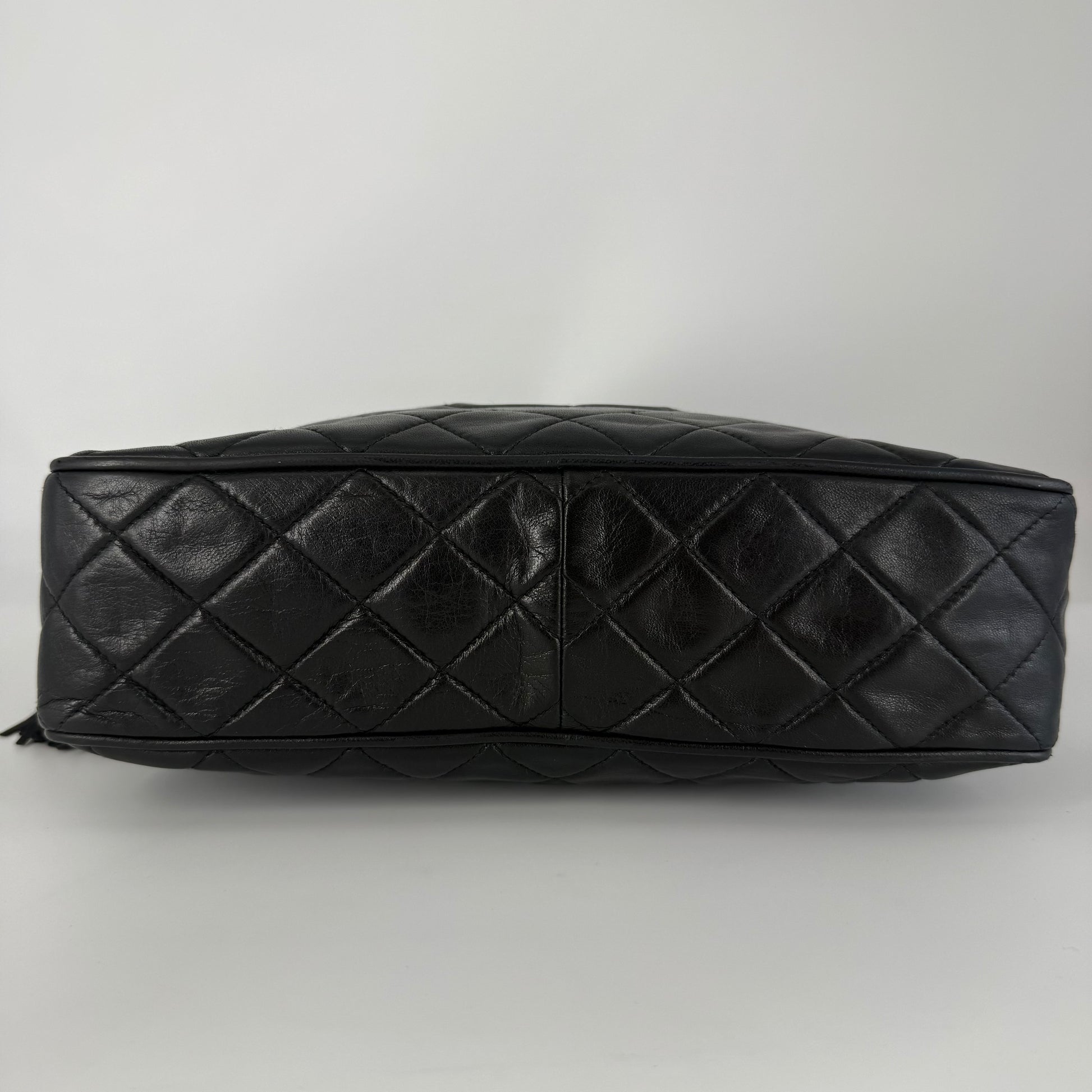 Exterior: Elegant black lambskin leather exterior in very good vintage condition. The structure remains beautifully intact with minor corner wear consistent with age. The leather retains its signature Chanel softness and luxurious shine. The gold-tone 24k hardware key charm adds a refined vintage touch.