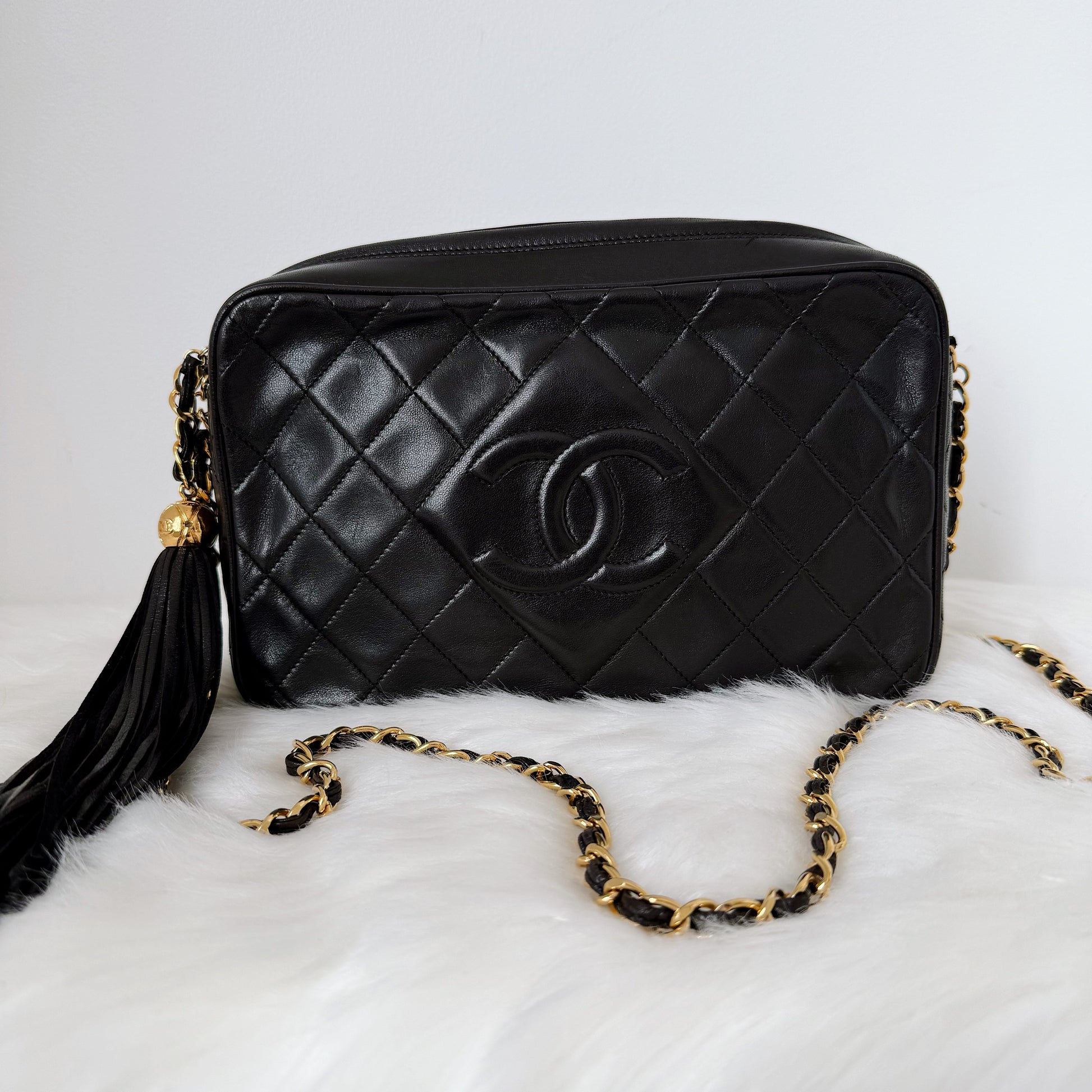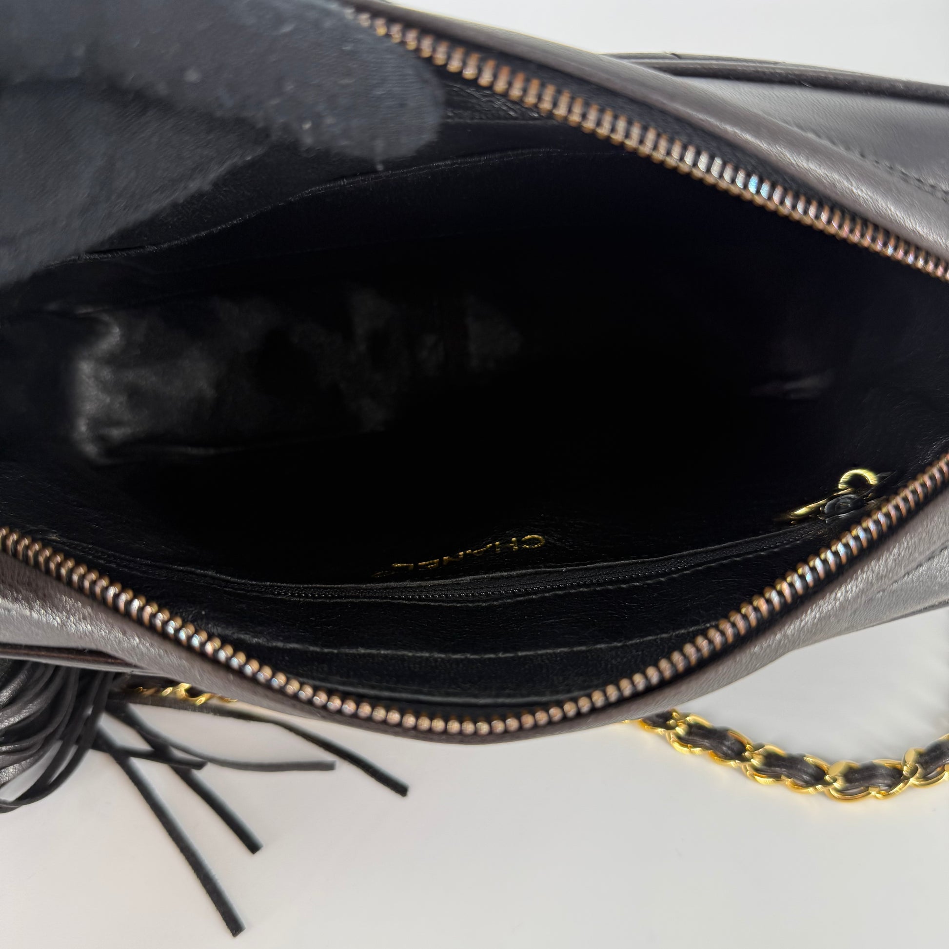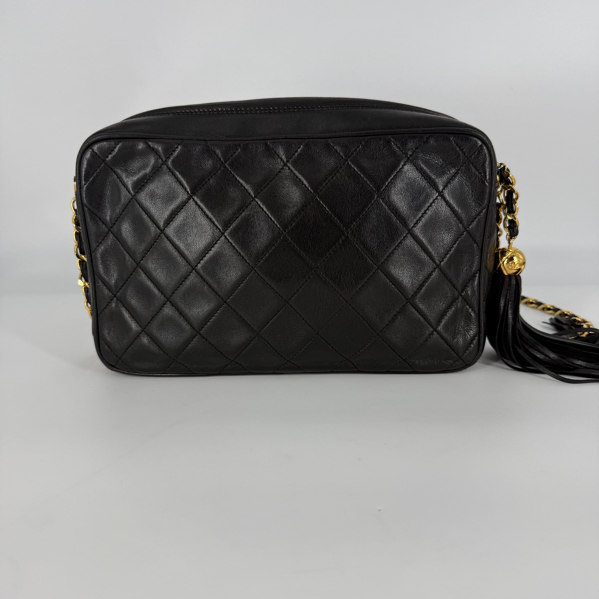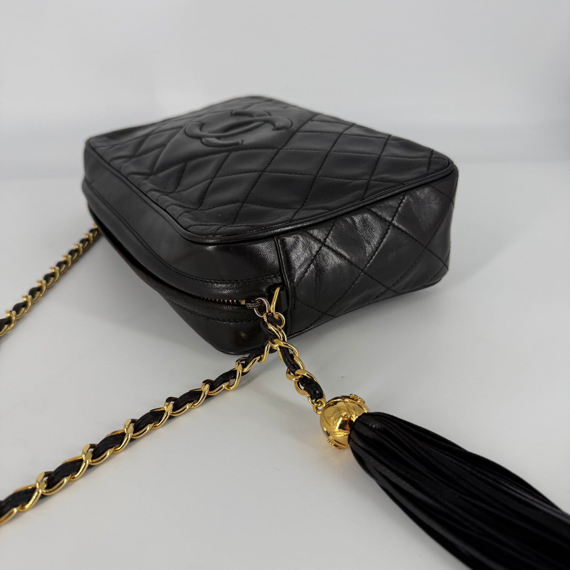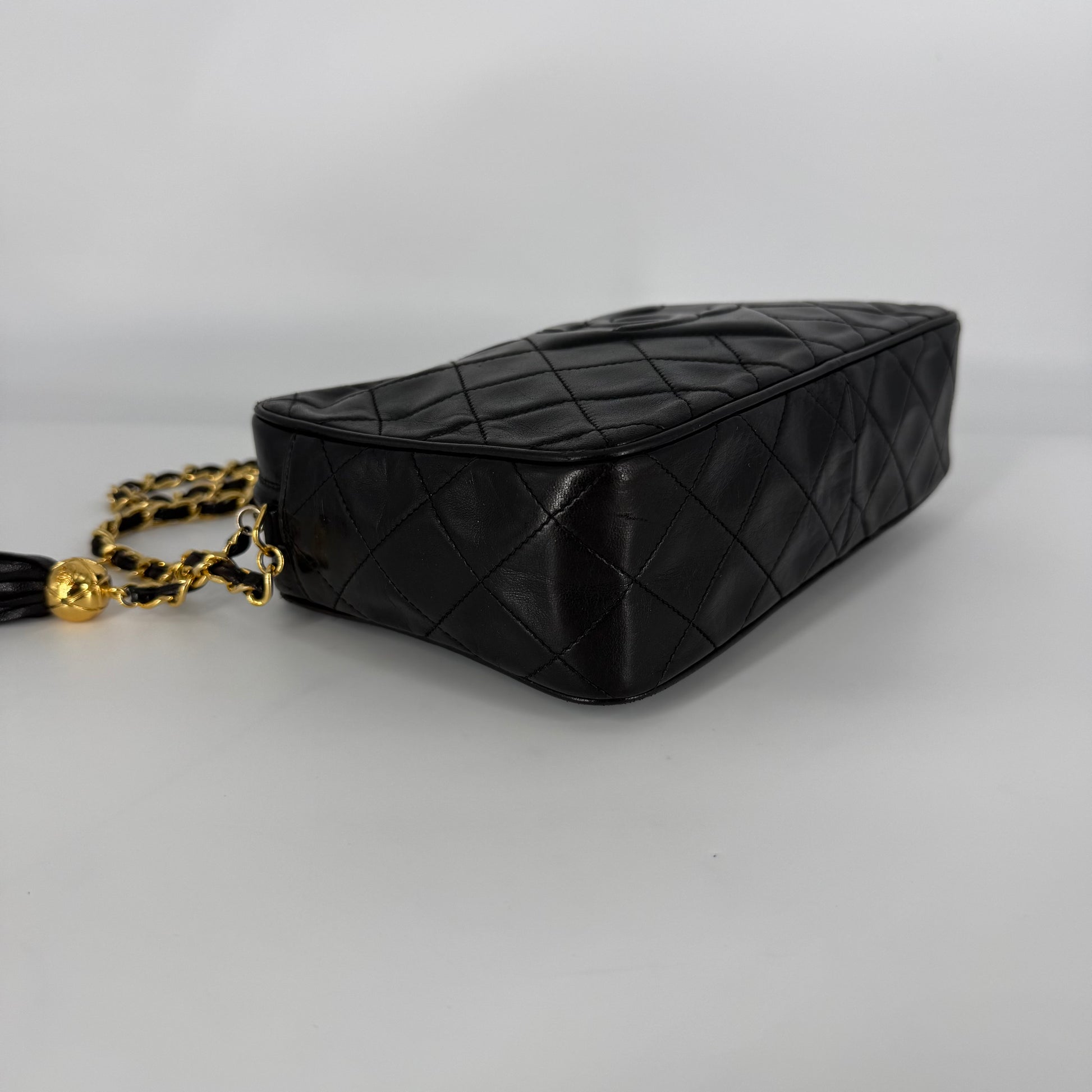 Exterior: Beautiful black diamond-quilted leather in excellent vintage condition. The leather is beautifully preserved with no holes, no tears, no cracks, and no odor. Corners present beautifully. The 24 Karat gold hardware remains bright, radiant, and very shiny. The tassel is intact and presents perfectly. Overall presentation is outstanding for a vintage Chanel piece.