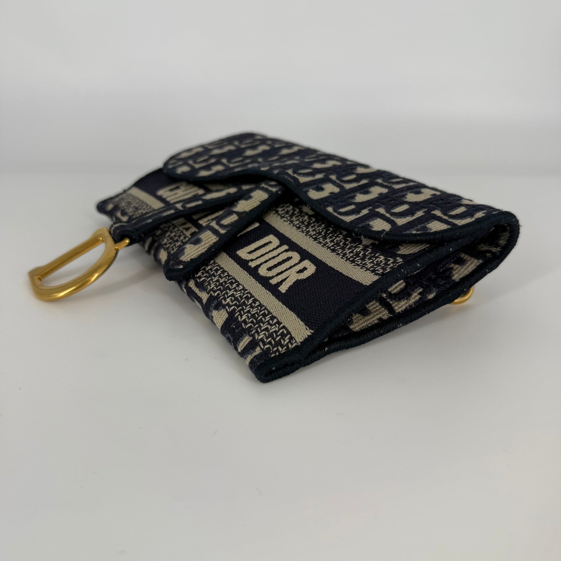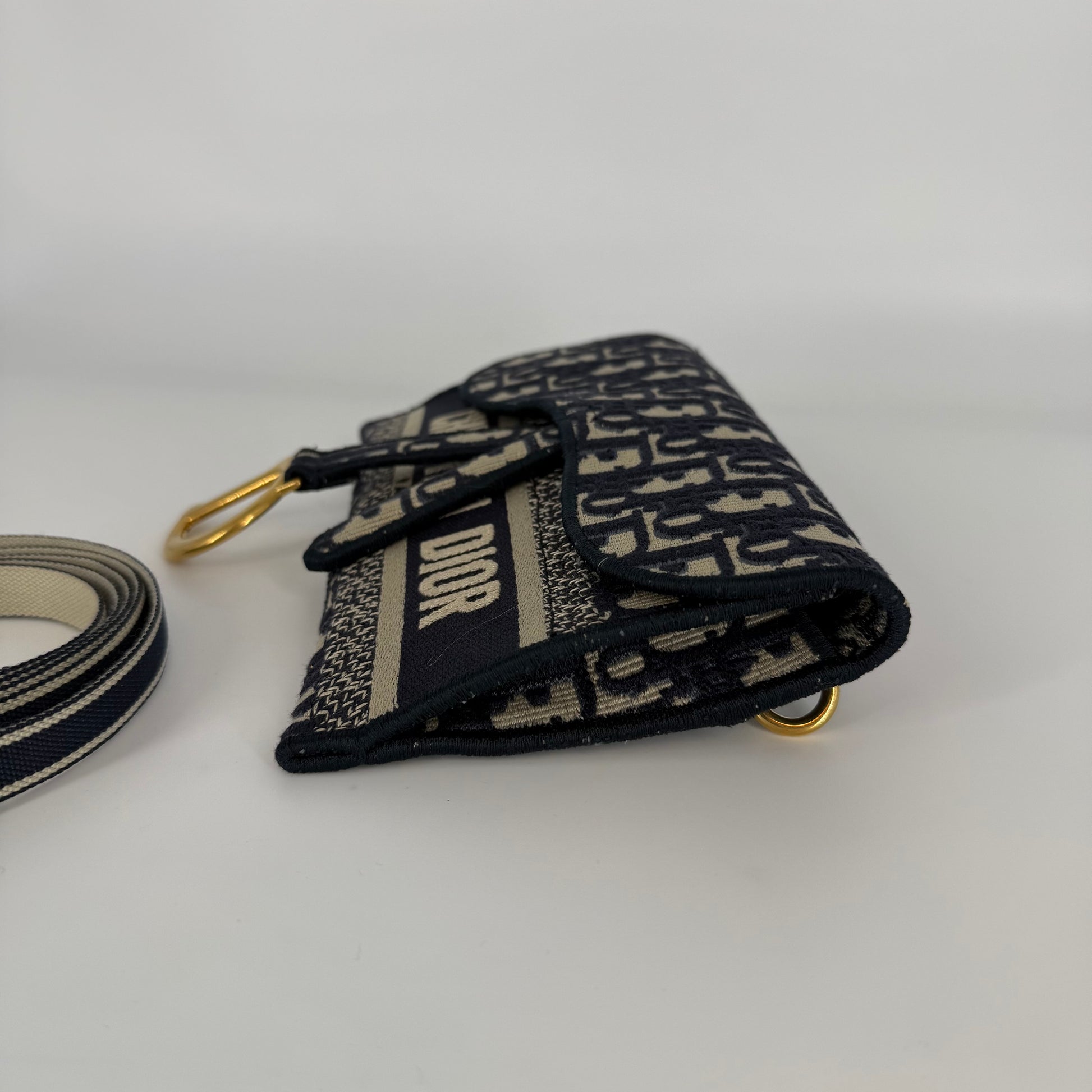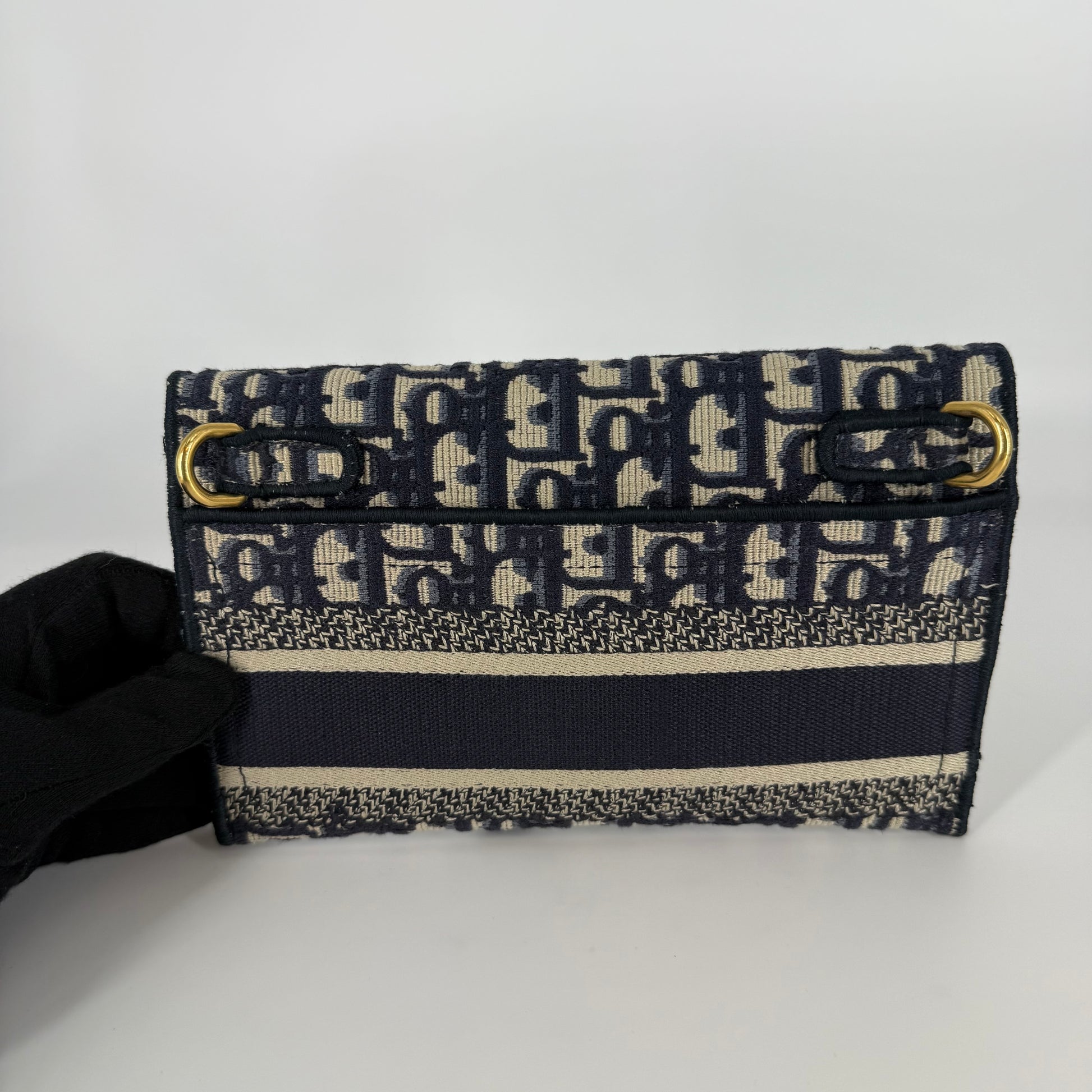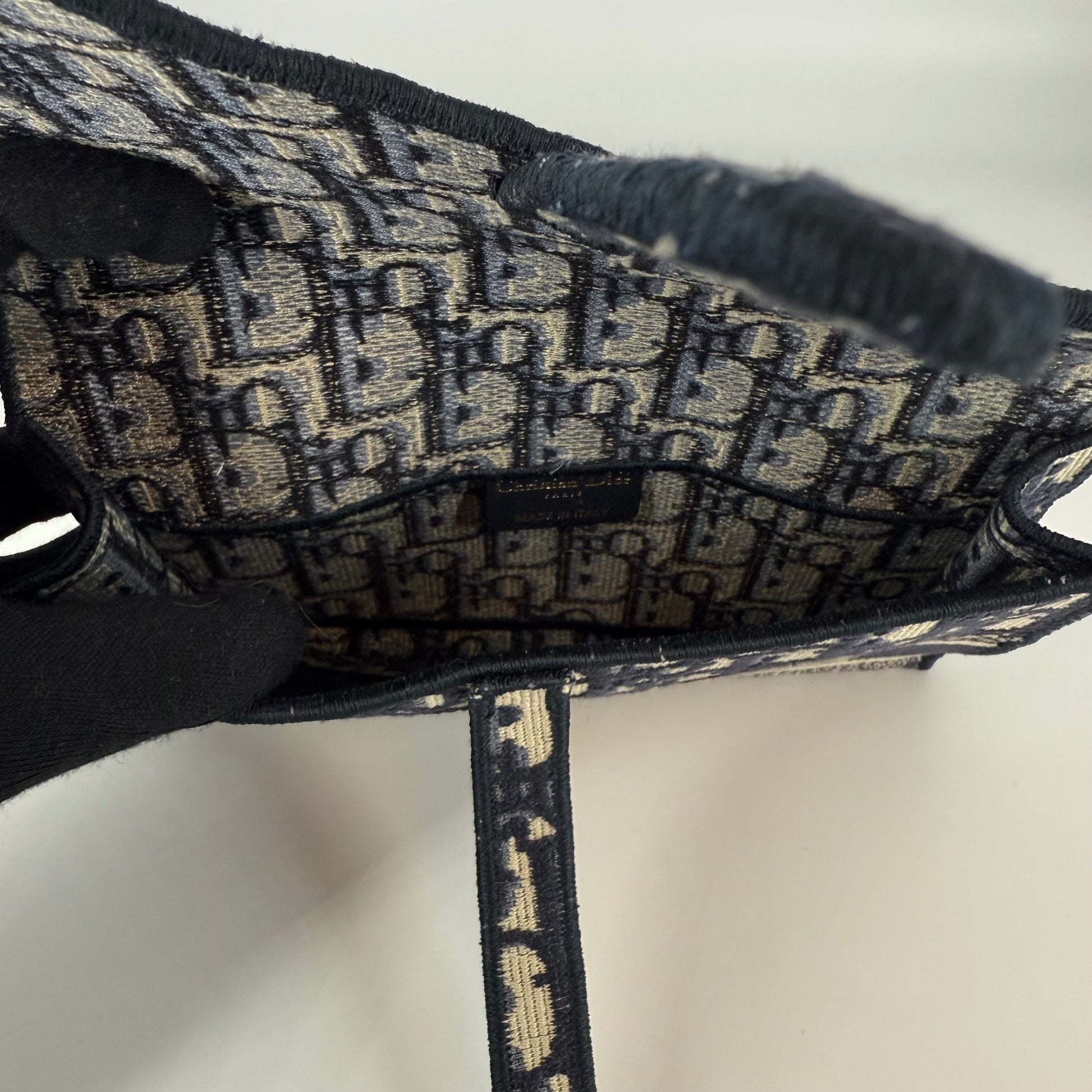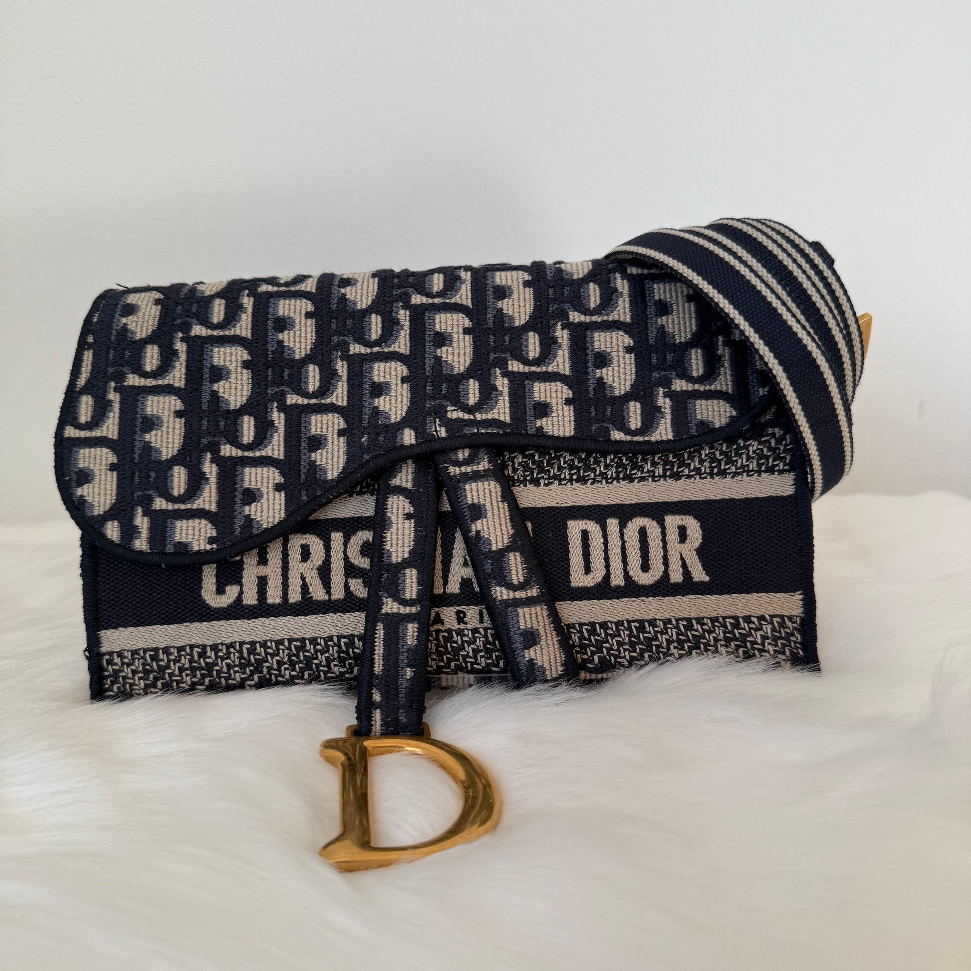 Exterior: Iconic Dior Oblique blue canvas in excellent condition no stains, tears, or signs of wear. The leather trim is smooth and intact, and the gold-tone “D” charm remains bright and untarnished. The flap closes perfectly and the “Christian Dior Paris” embroidery is crisp and vibrant.