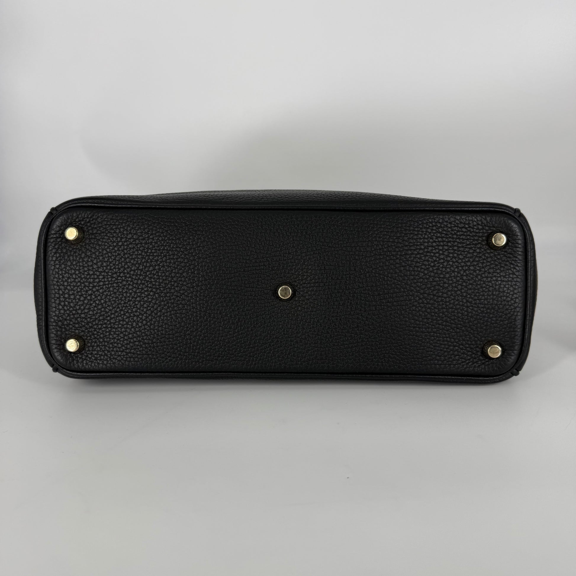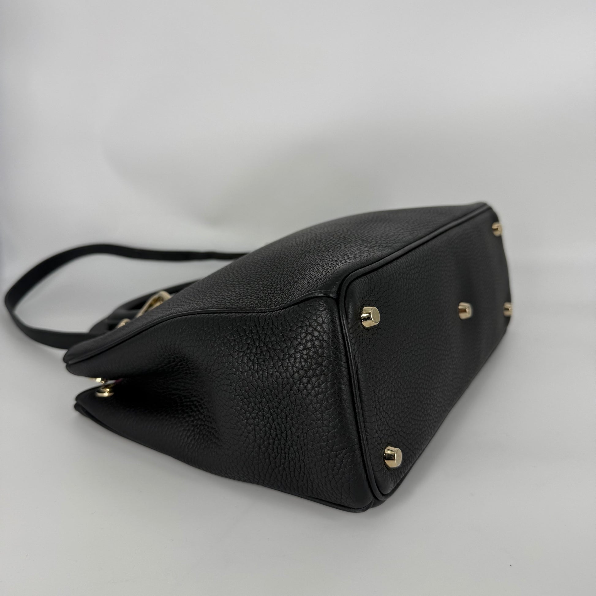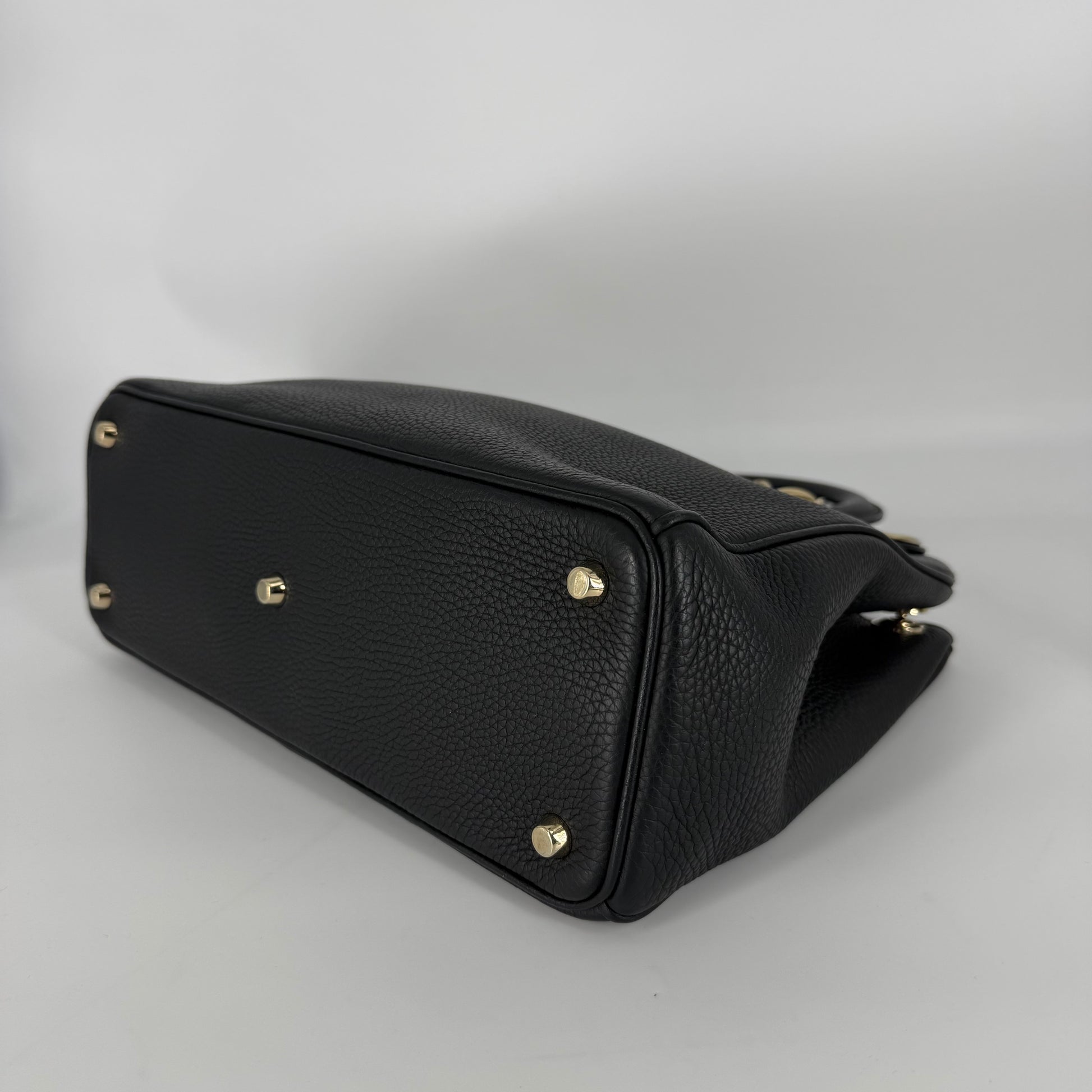 Exterior: Black grained leather beautifully preserved and exceptionally well maintained. The bag presents impeccably with fully intact corners and no visible wear. The leather remains supple and structured. Protective stickers are still present on portions of the hardware.