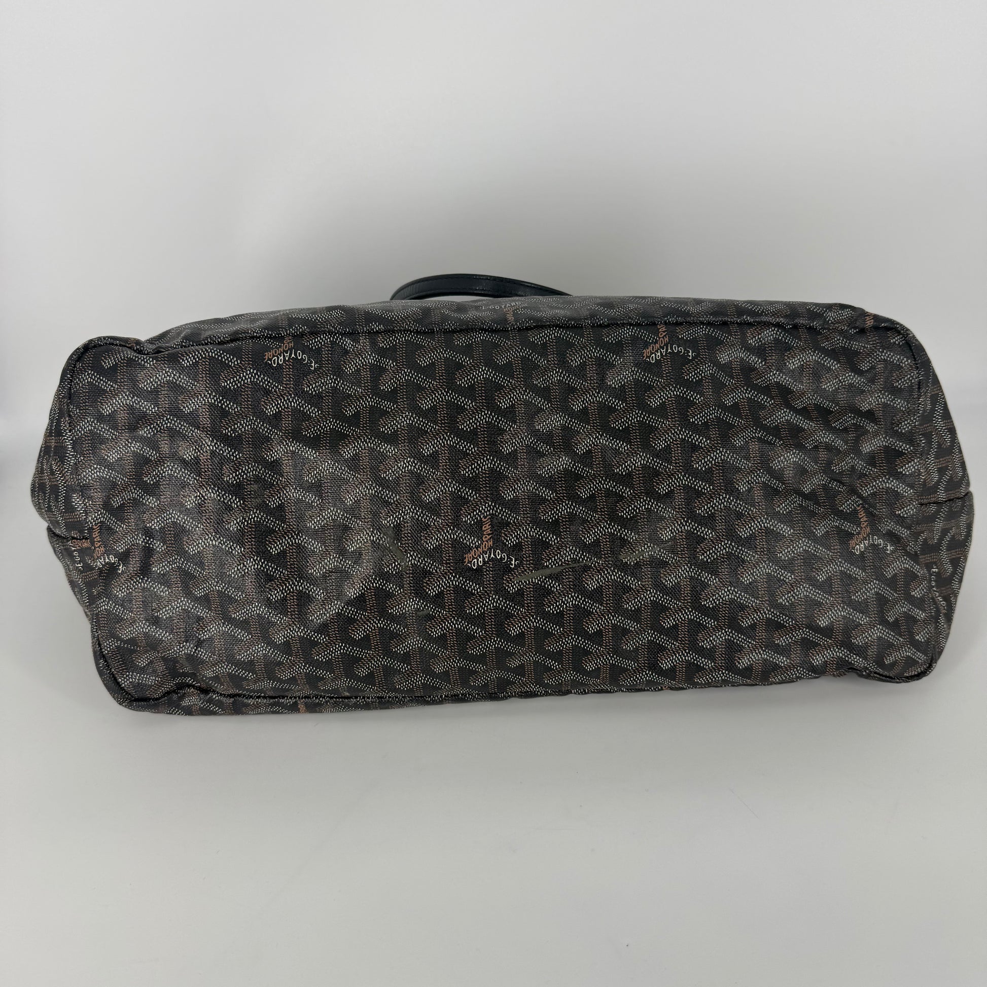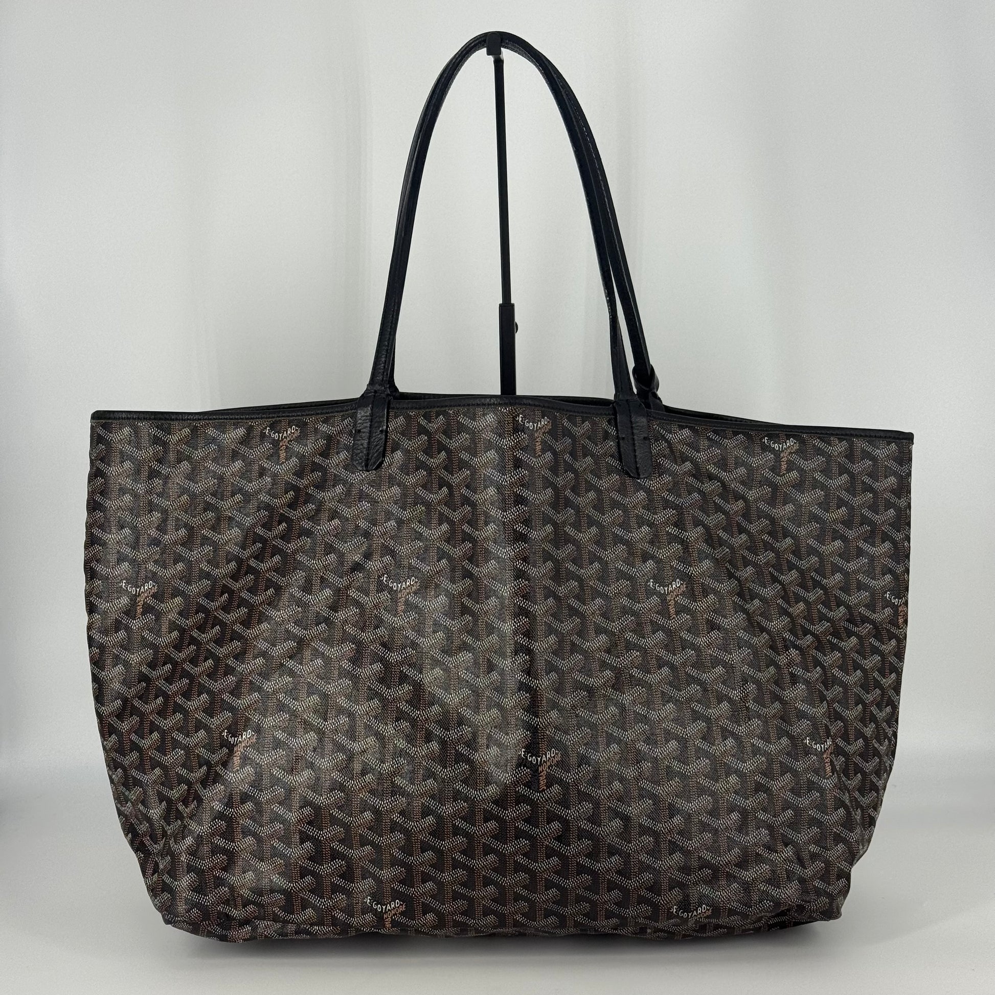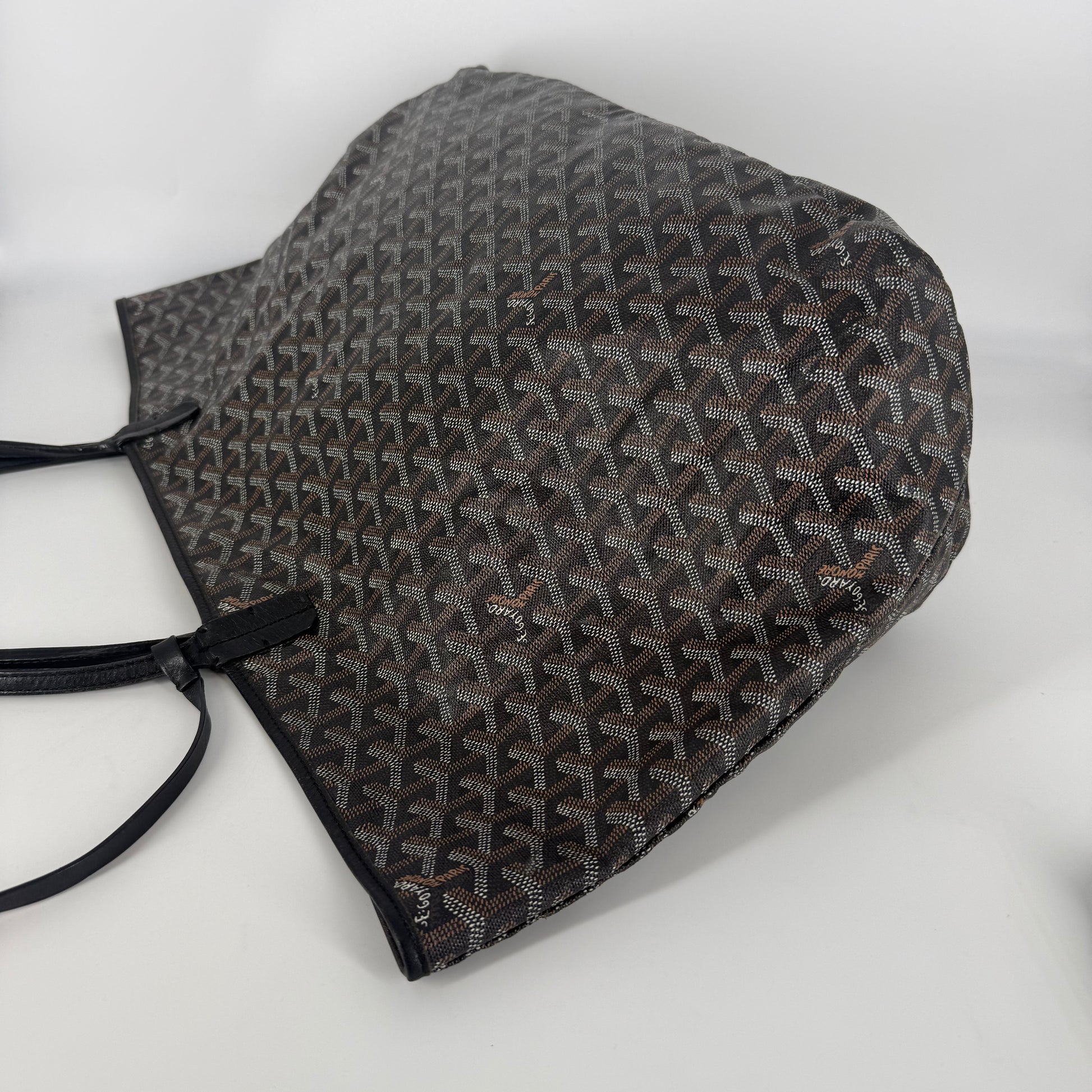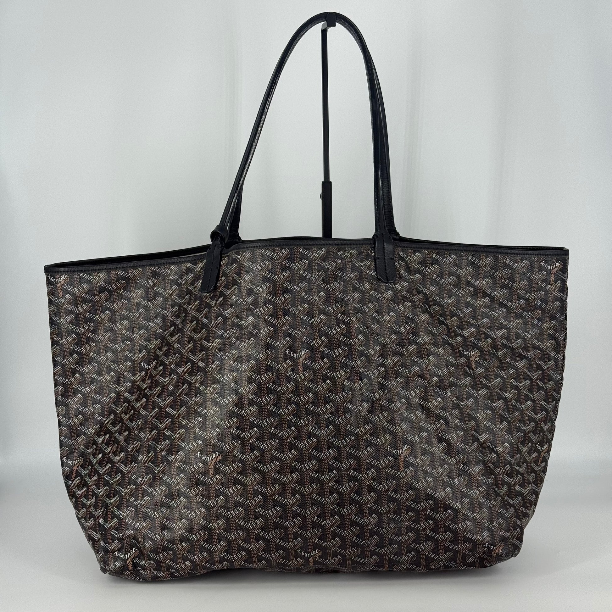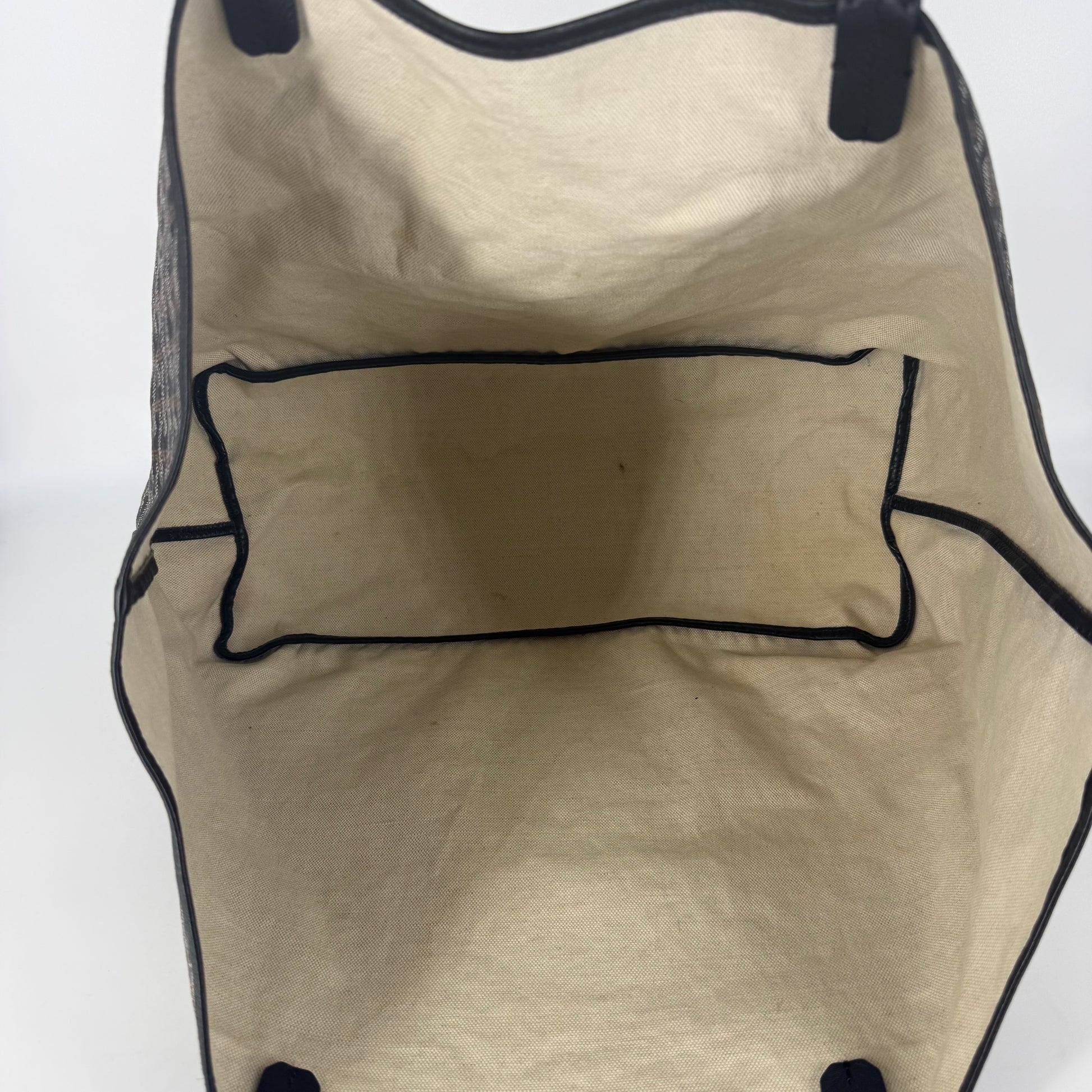 Exterior: Iconic Goyard Saint-Louis GM tote crafted in signature Goyardine canvas with black leather handles. The canvas remains beautiful overall and the bag holds its shape well. The leather is supple with no holes or major defects to note. Handles remain strong and fully functional.