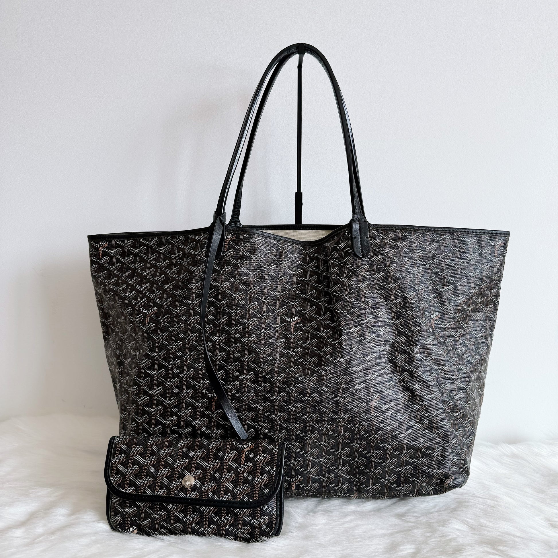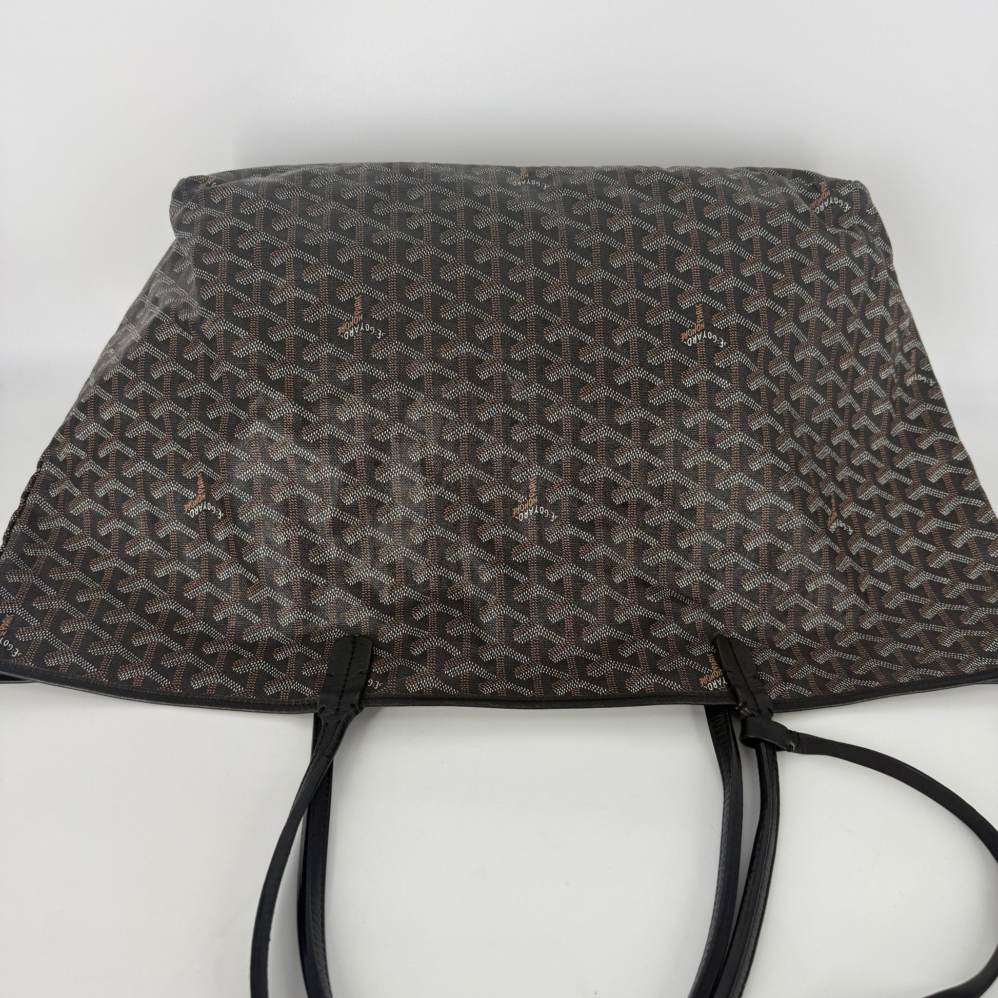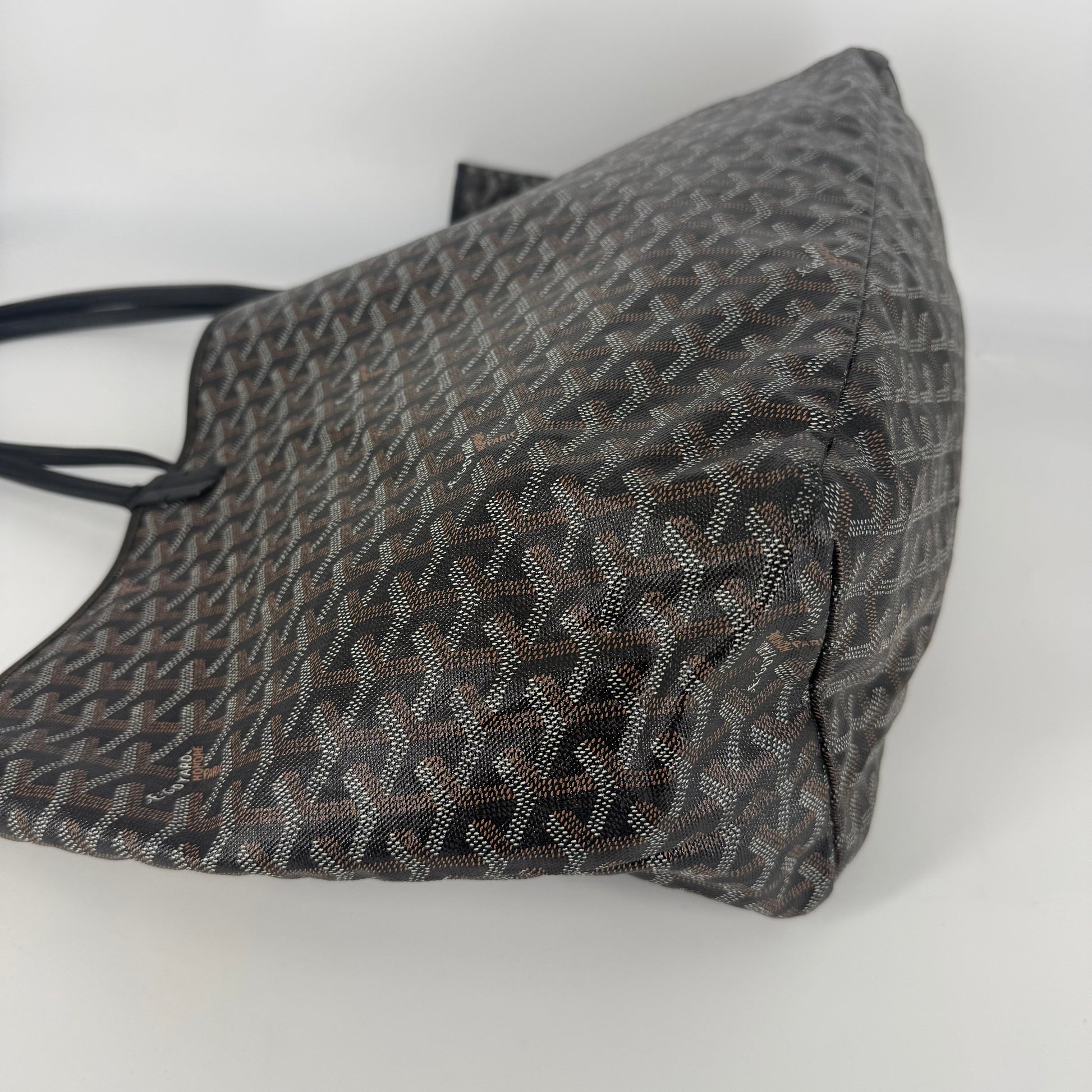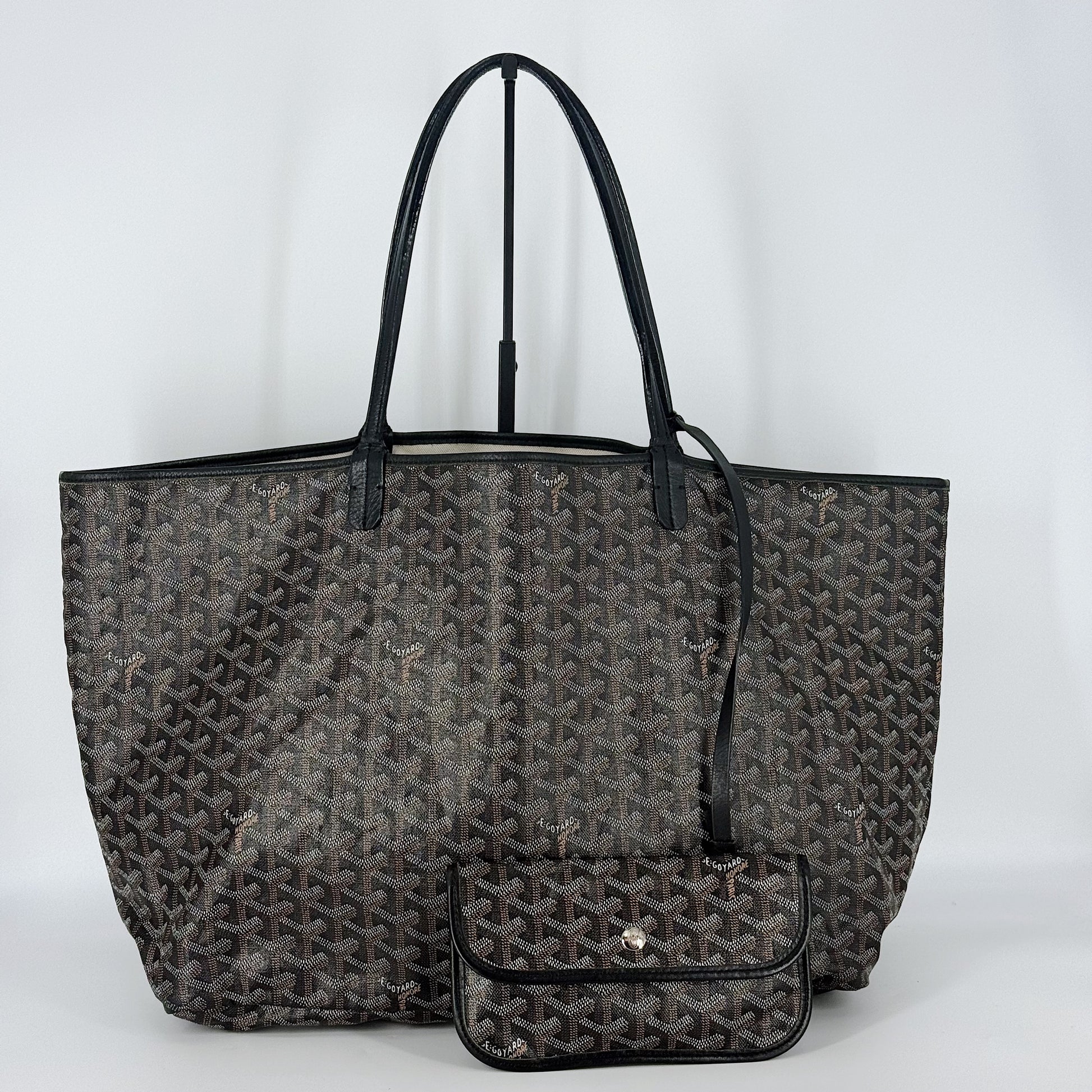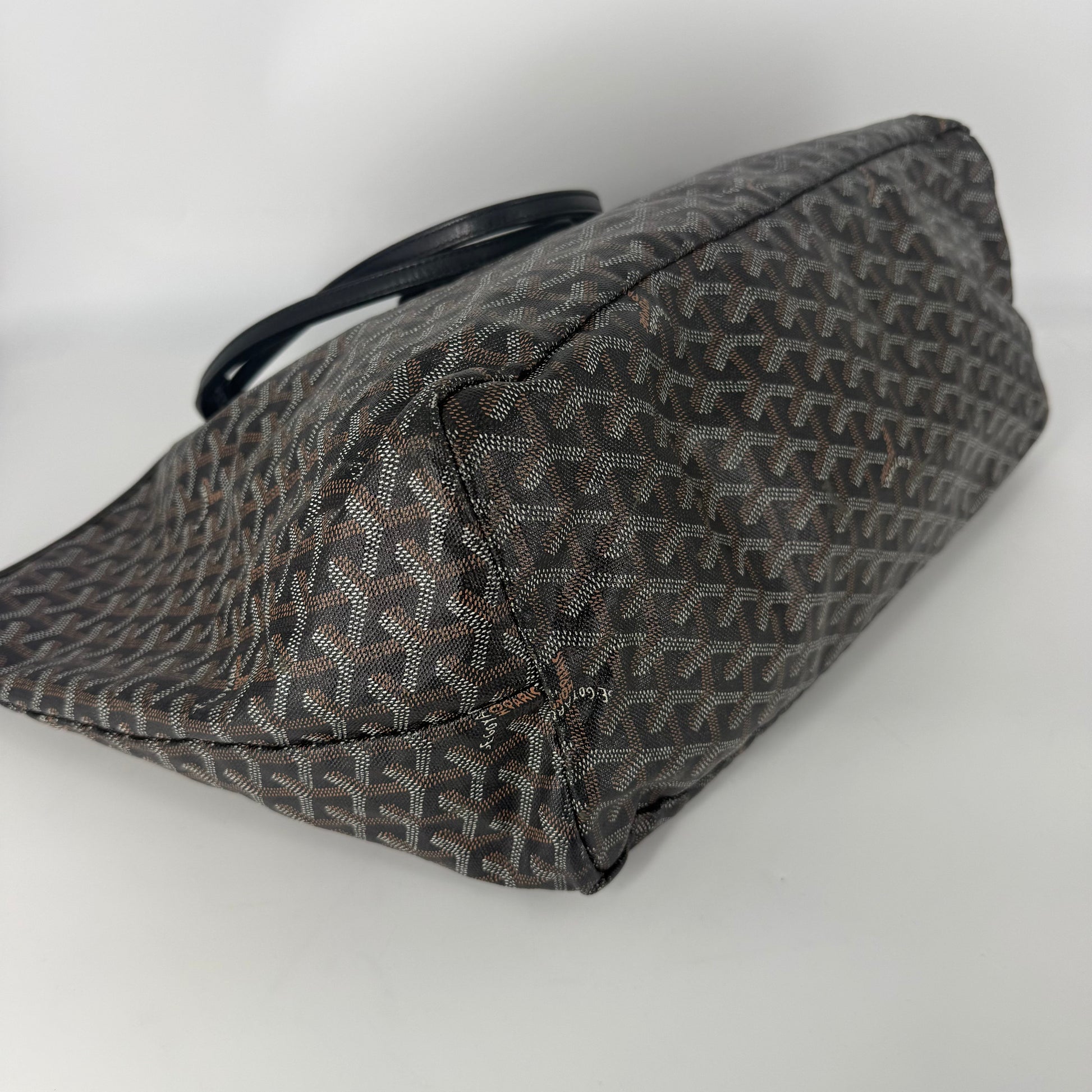 Exterior: Iconic Goyard Saint-Louis GM tote crafted in signature Goyardine canvas with black leather handles. The canvas remains beautiful overall and the bag holds its shape well. The leather is supple with no holes or major defects to note. Handles remain strong and fully functional.