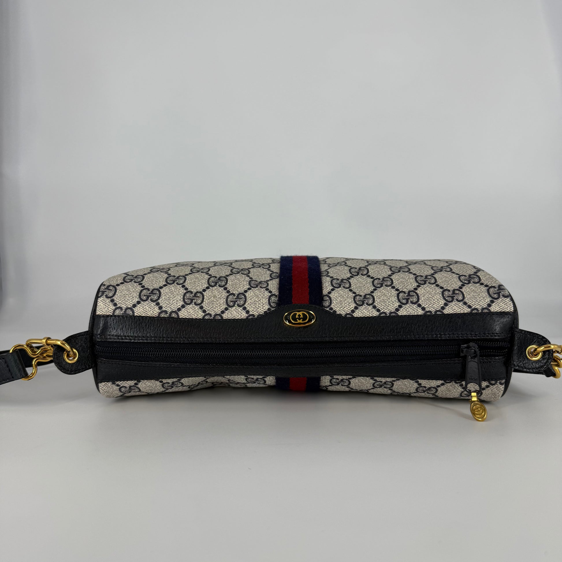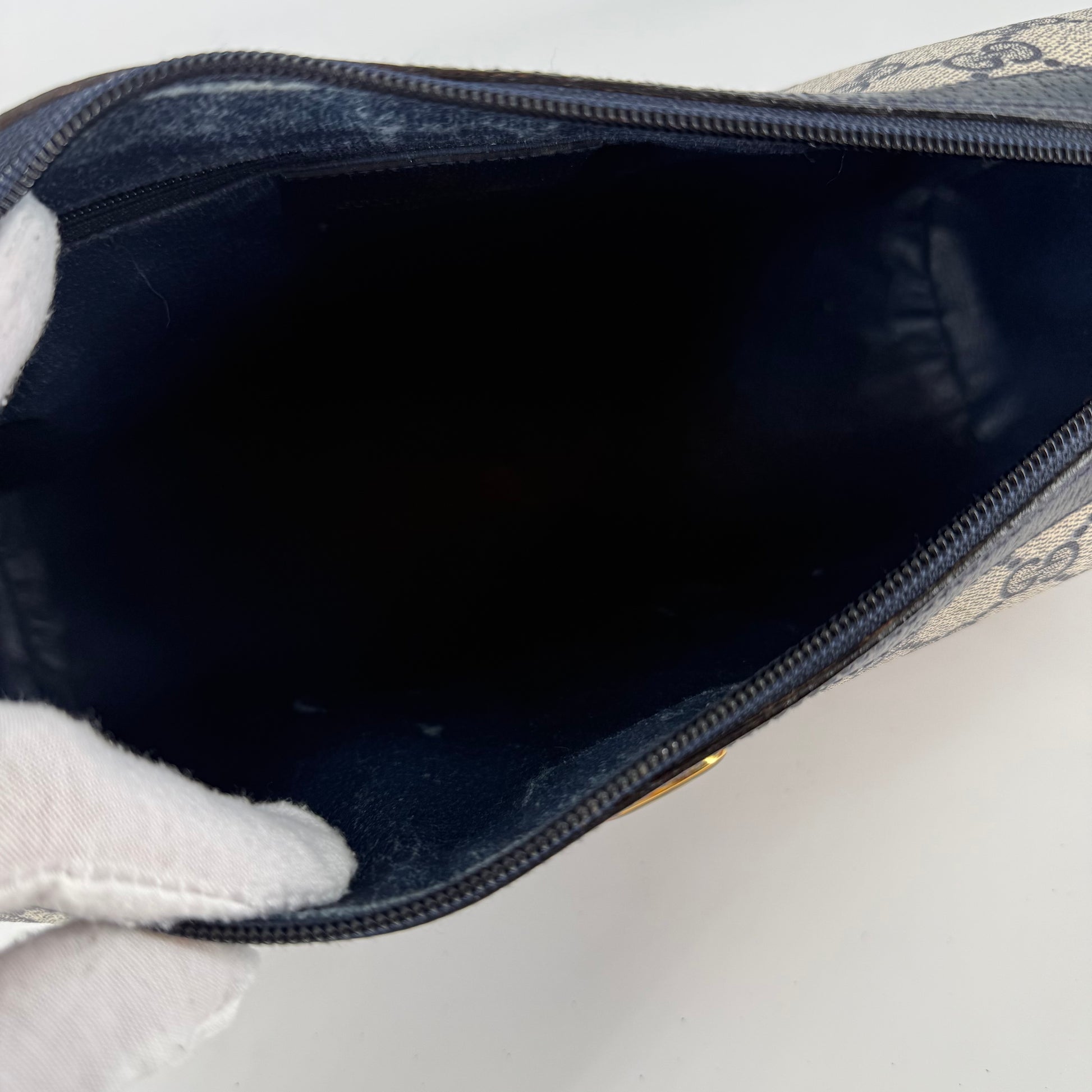 Exterior: GG Supreme canvas is spotless and vibrant, showing no stains or signs of wear. Corners are clean and intact. The overall condition is excellent nearly like new.