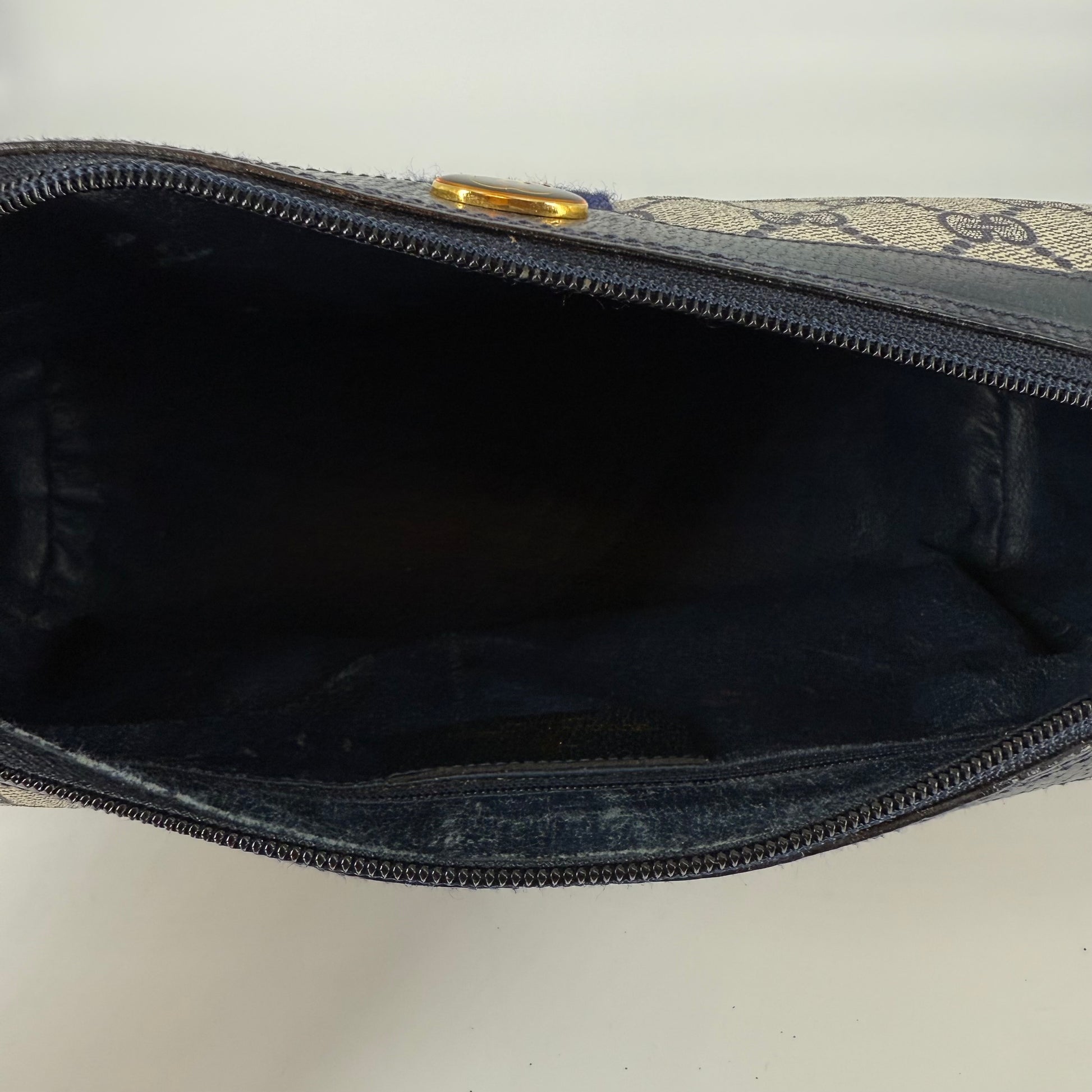 Interior: Fully intact with no hole or structural damage. Shows signs of use and some wear to the interior leather lining, but nothing that affects the functionality of the bag.
