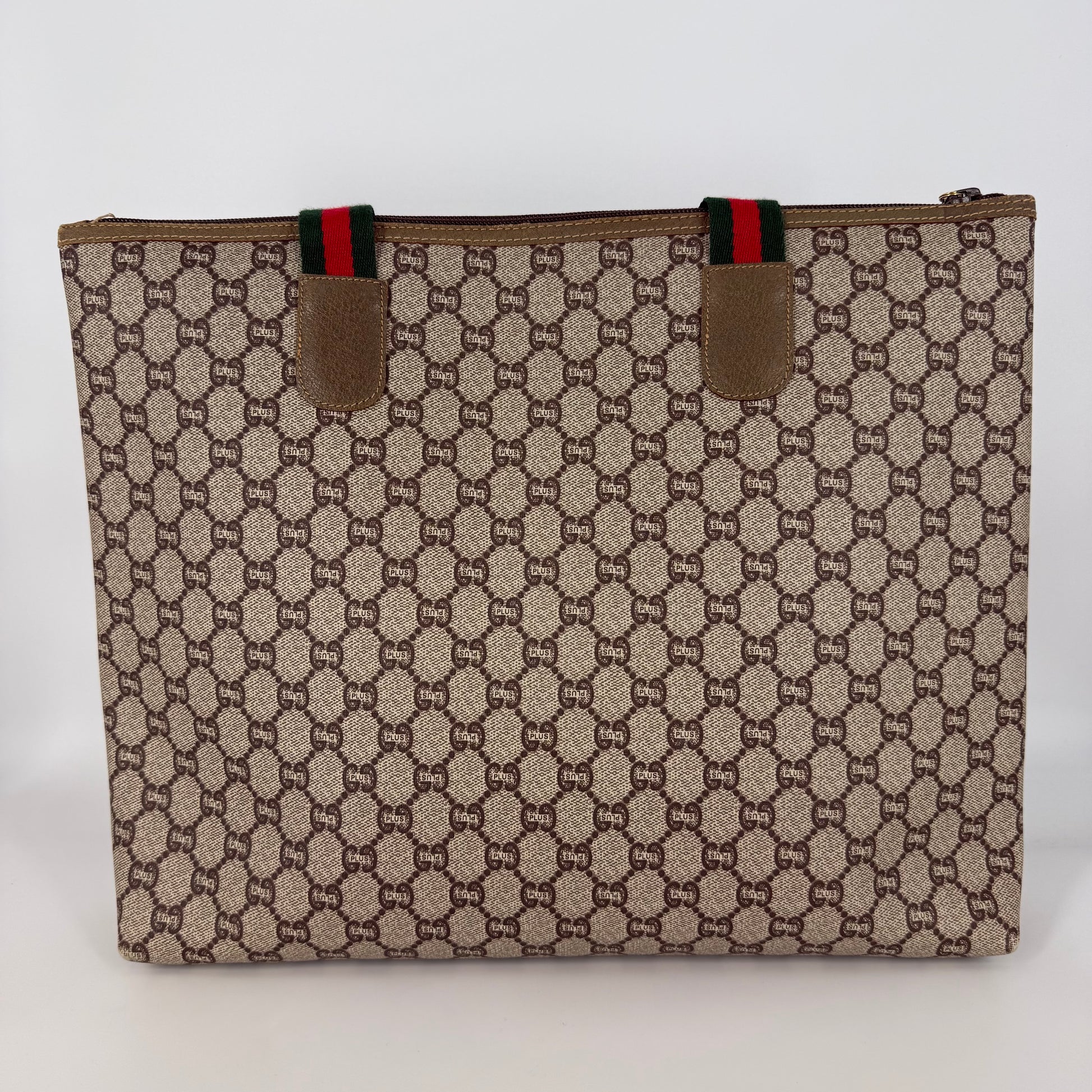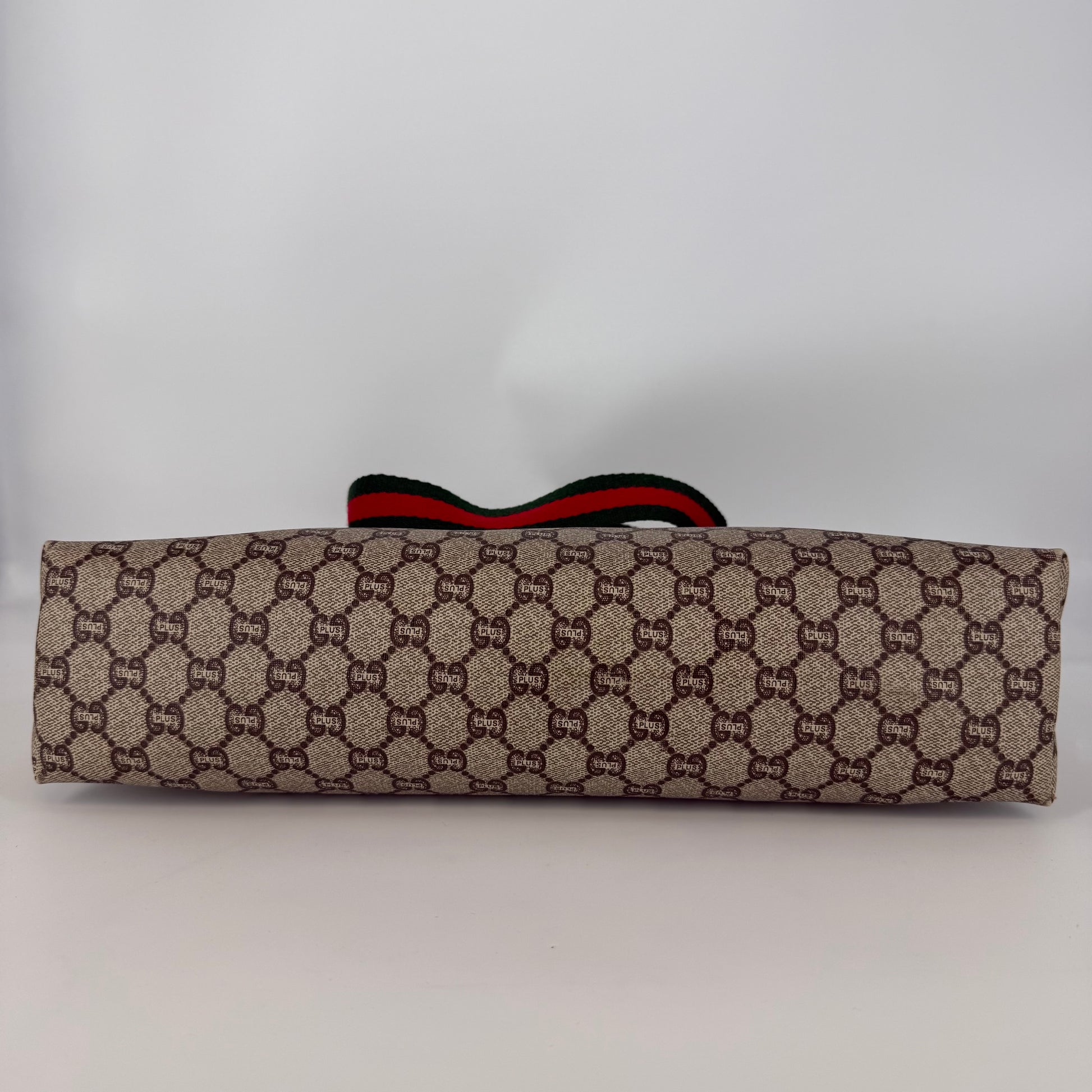 Exterior: Beige/brown Gucci Plus GG coated canvas in very good condition. No holes, no stains, the canvas is clean overall. Shows small signs of use with some rubbing at the corners, typical for vintage Gucci pieces.