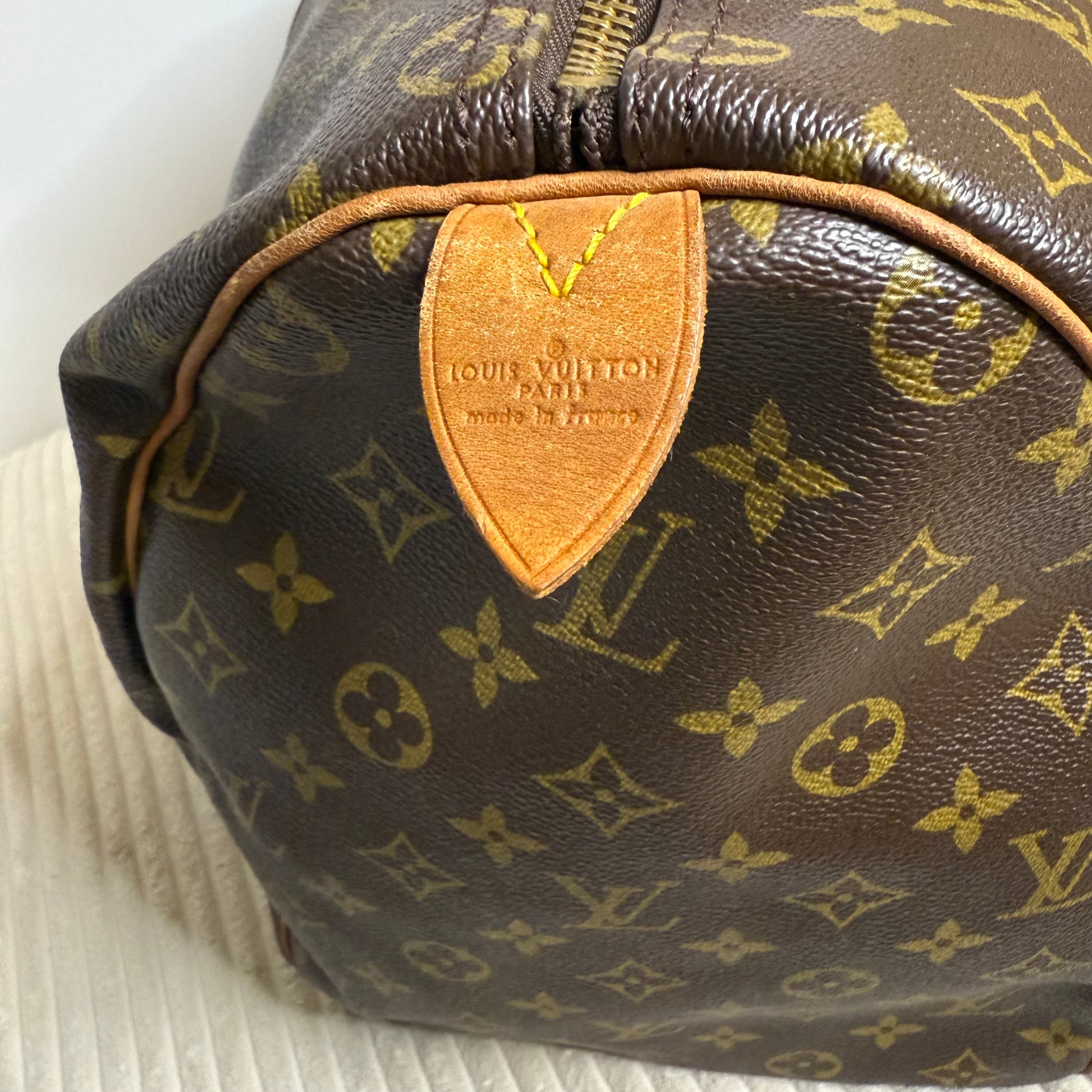• Vintage - Fair Condition – Clear signs of age with multiple visible flaws, such as heavy rubbing, darkened patina on vachetta leather, cracks, or corner wear. The interior may have stains or slight peeling in pockets. The hardware may be tarnished or oxidized, but the bag remains functional and authentic.