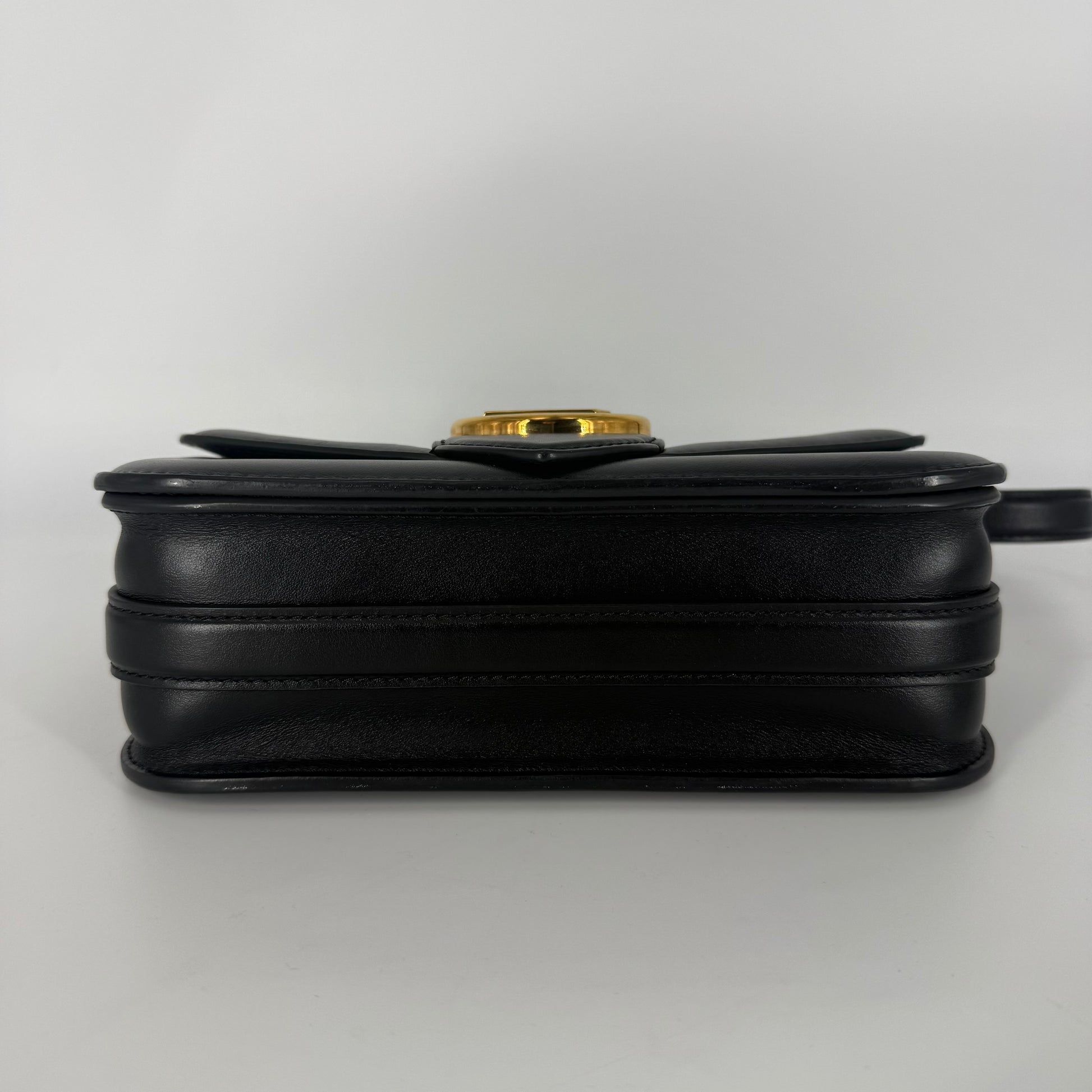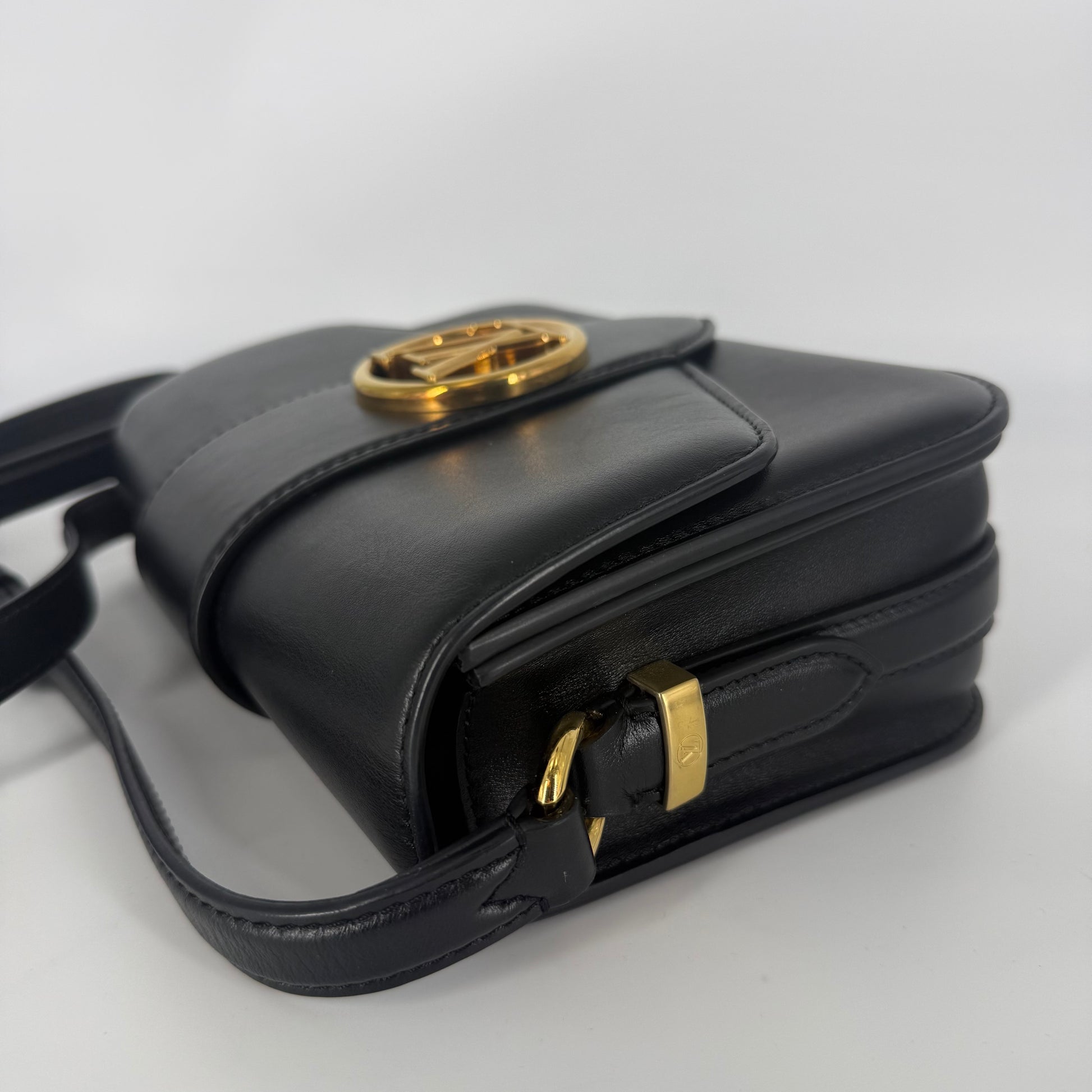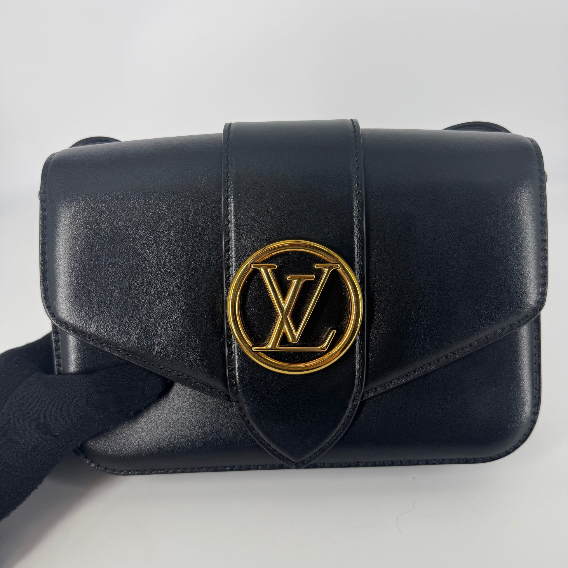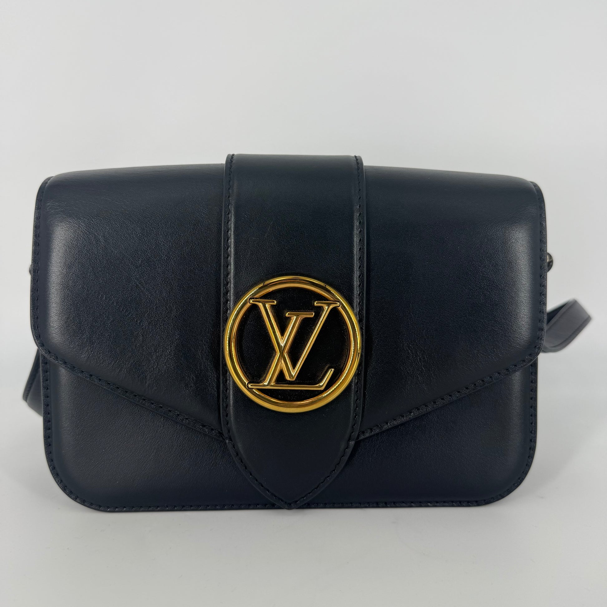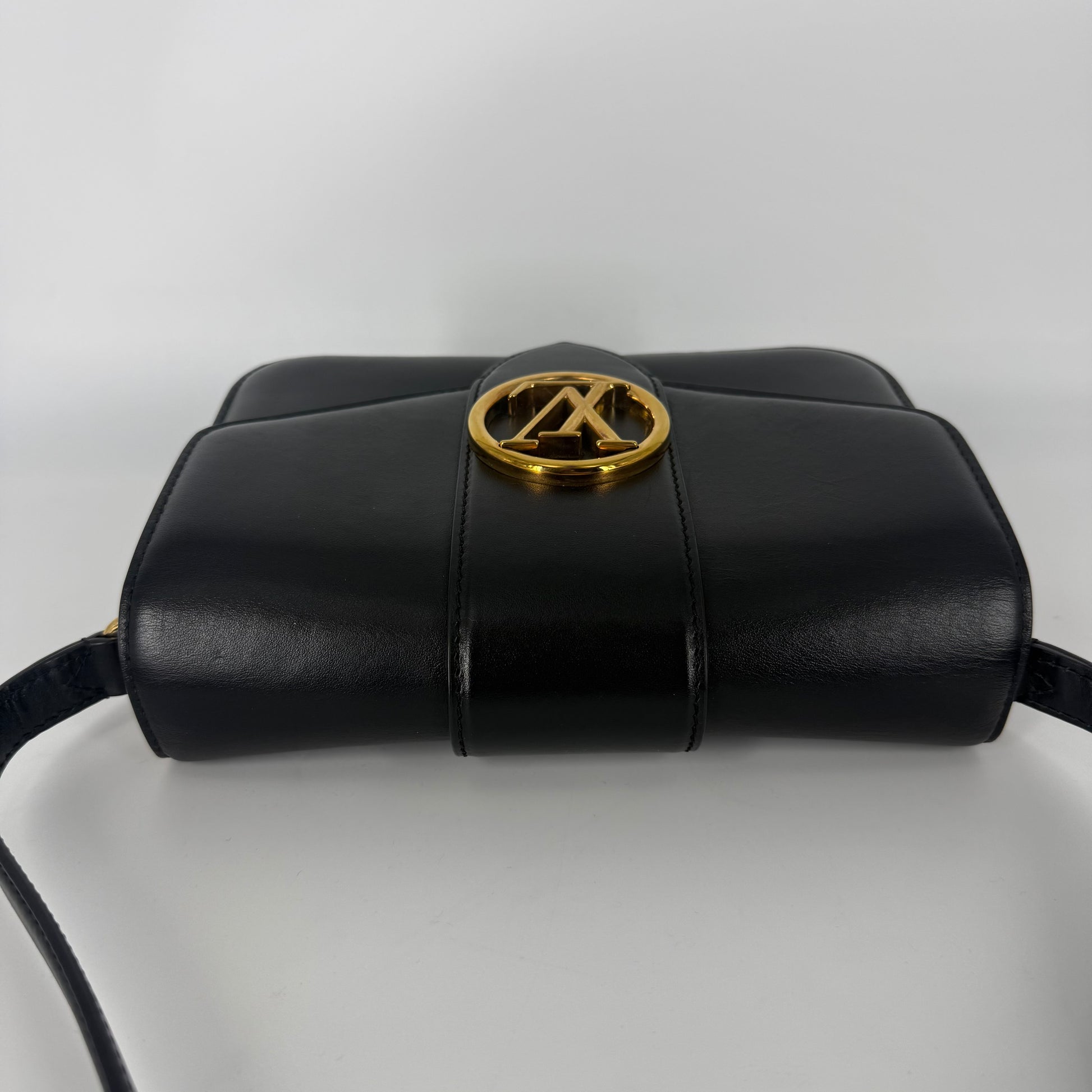 Exterior: Elegant Louis Vuitton Pont Neuf crafted in smooth black leather featuring the iconic LV circular clasp in gold-tone hardware. The leather remains beautiful overall with no holes and no major defects to note. Corners are in excellent condition. Light natural leather impressions may be visible on the front flap due to the pressure of the LV clasp when the bag is closed; this is a normal characteristic of this model and not a defect.