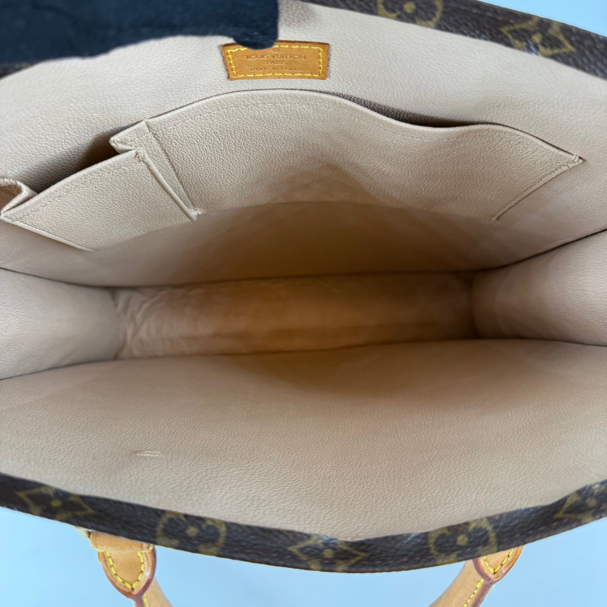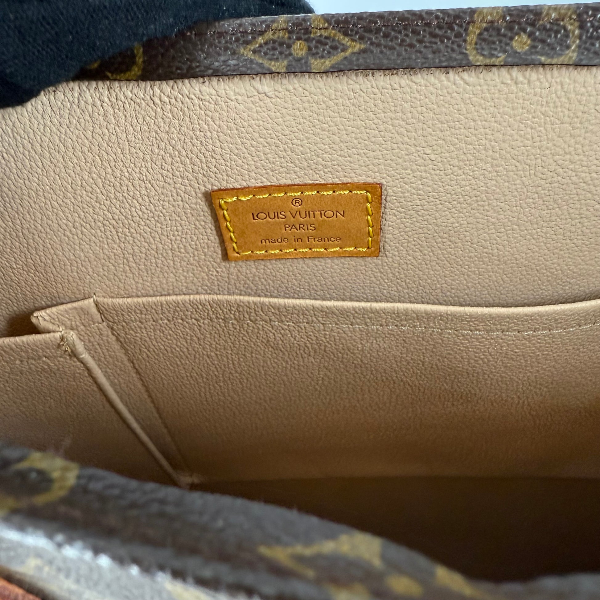 Interior: Shows visible signs of wear consistent with age. The lining has softened and shows areas of separation along the sides, typical of vintage Louis Vuitton models. While the interior remains functional, it is graded in good condition.