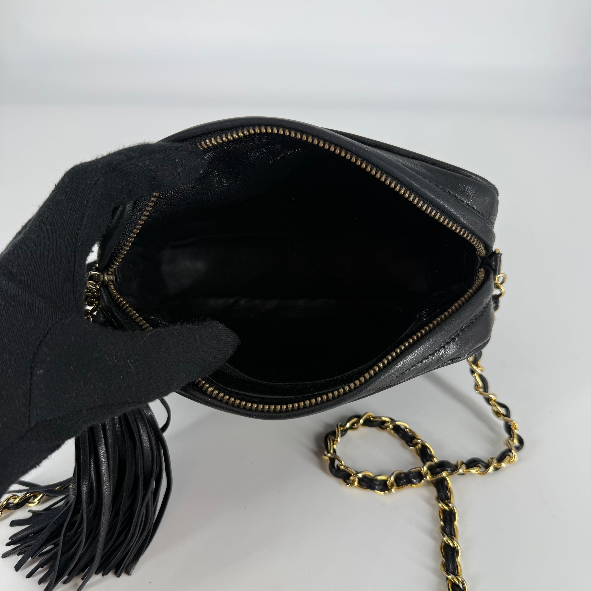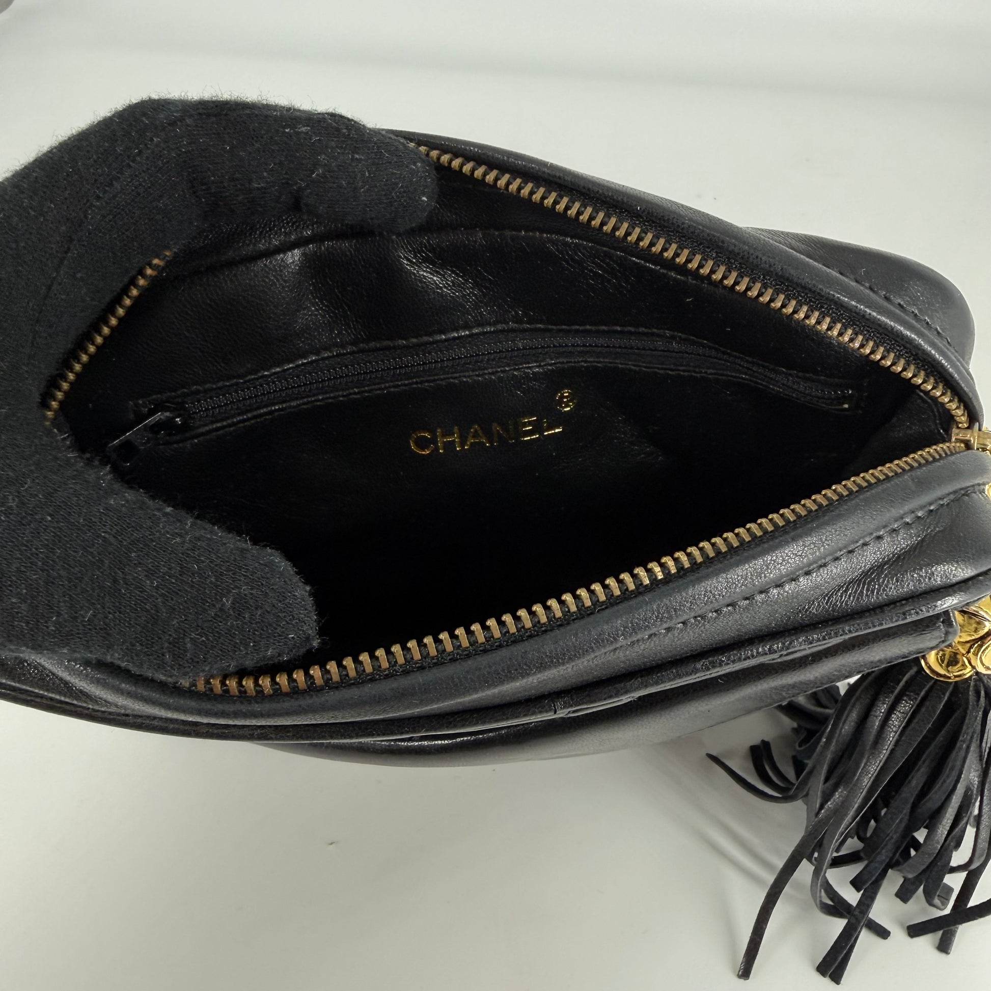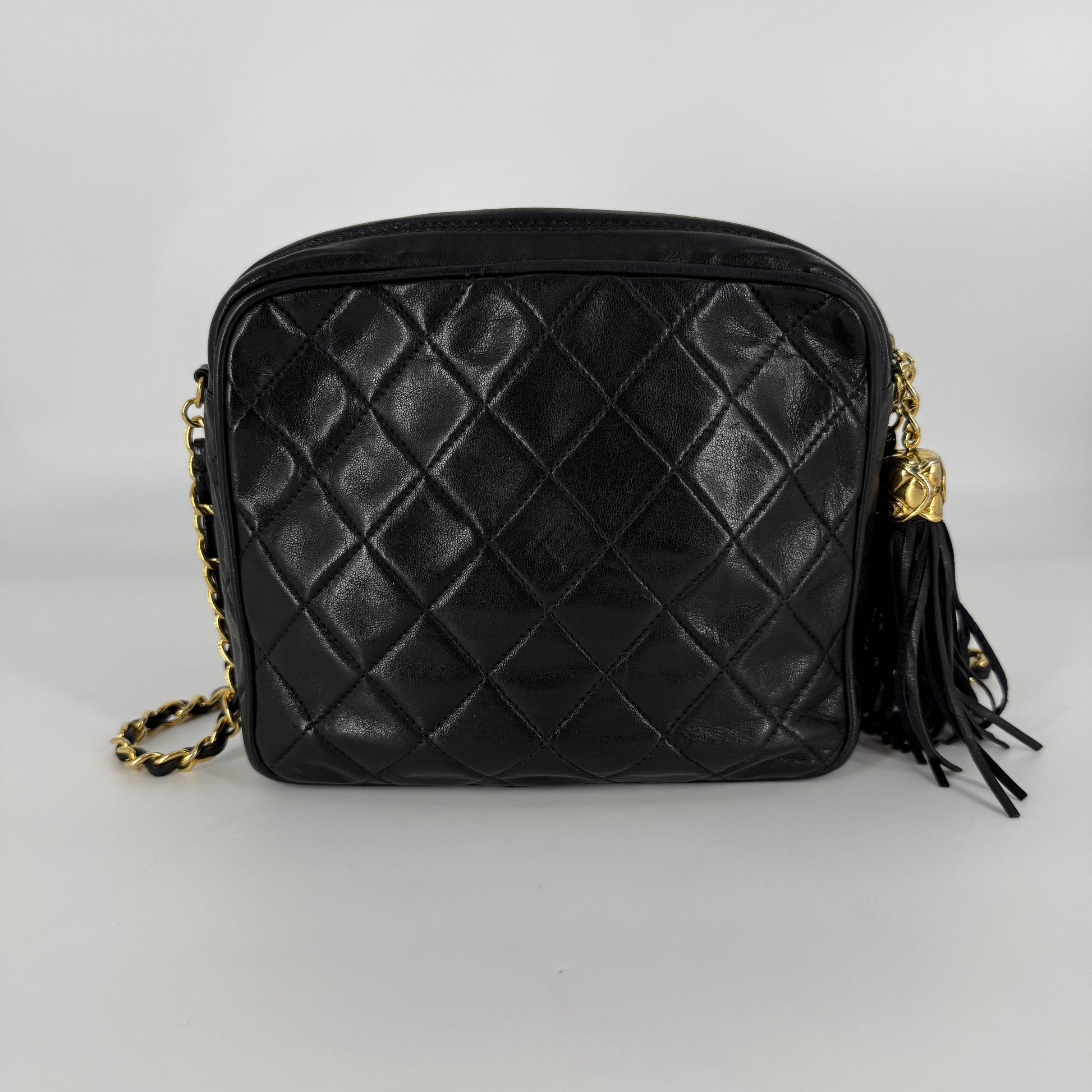 Exterior: Beautiful black diamond-quilted leather in excellent vintage condition. The leather is well preserved with no holes, no tears, no cracks, and no odor. There are no visible marks. The Chanel stamp remains beautiful and well defined. Overall presentation is exceptional for a vintage piece.