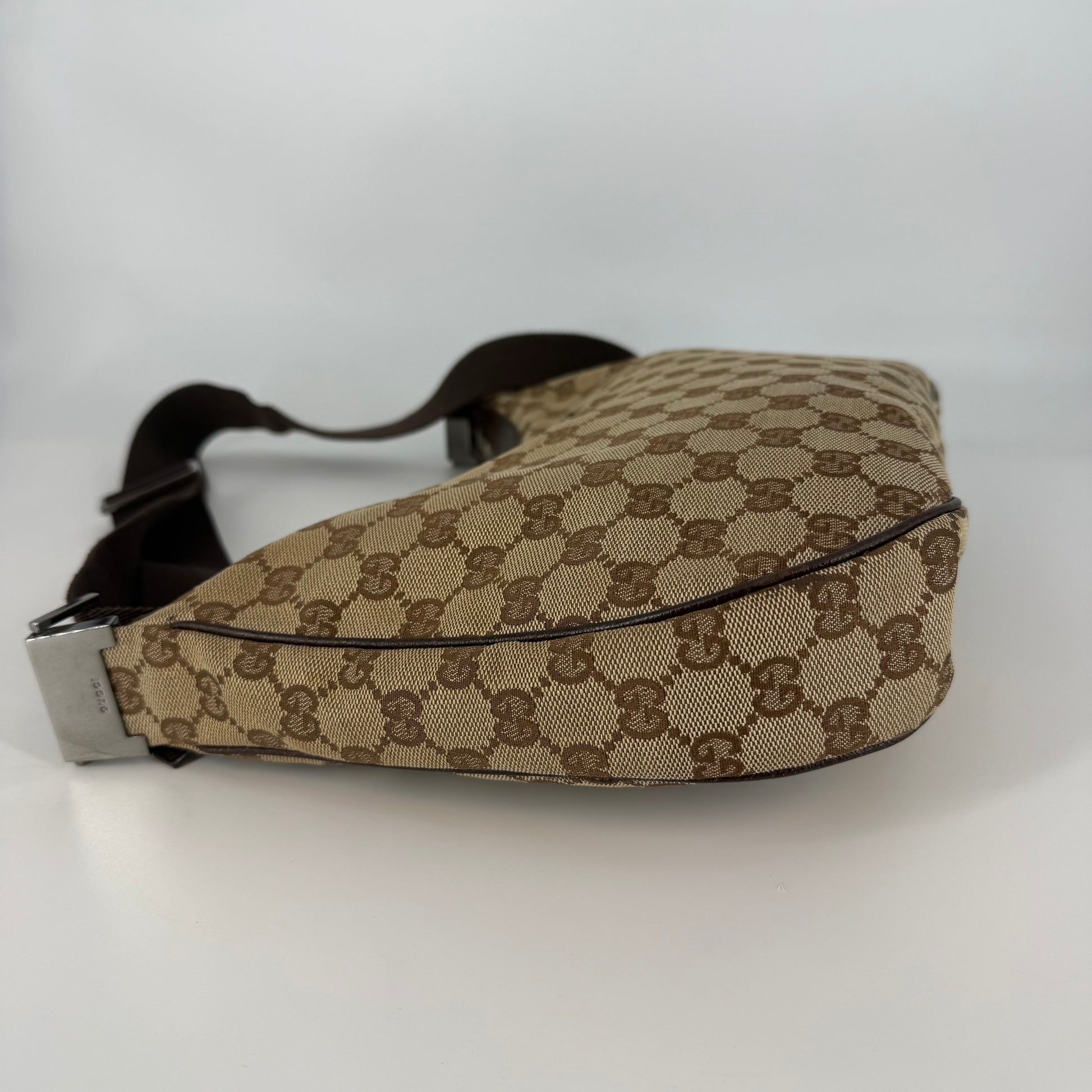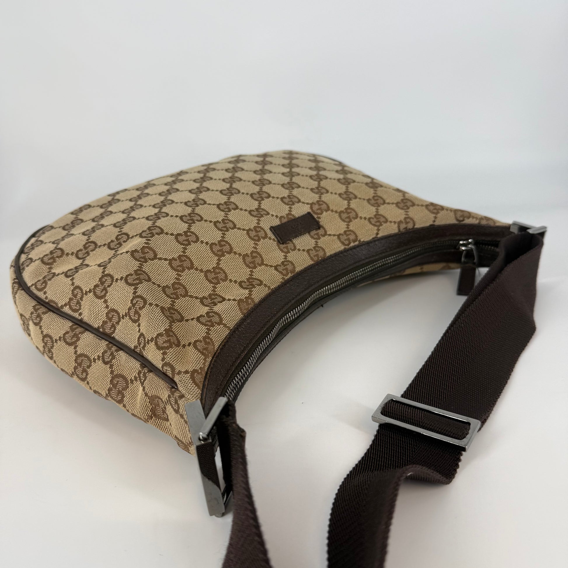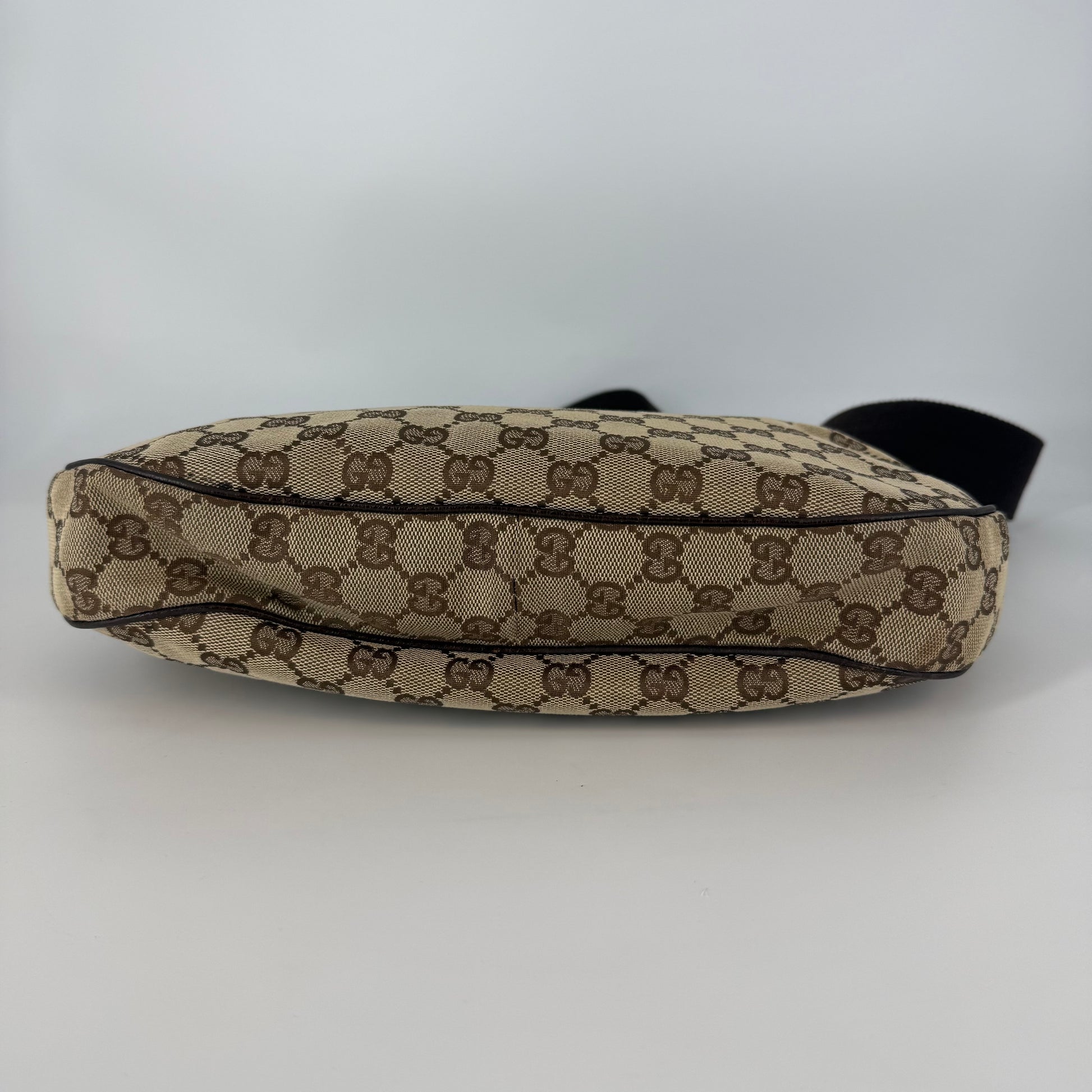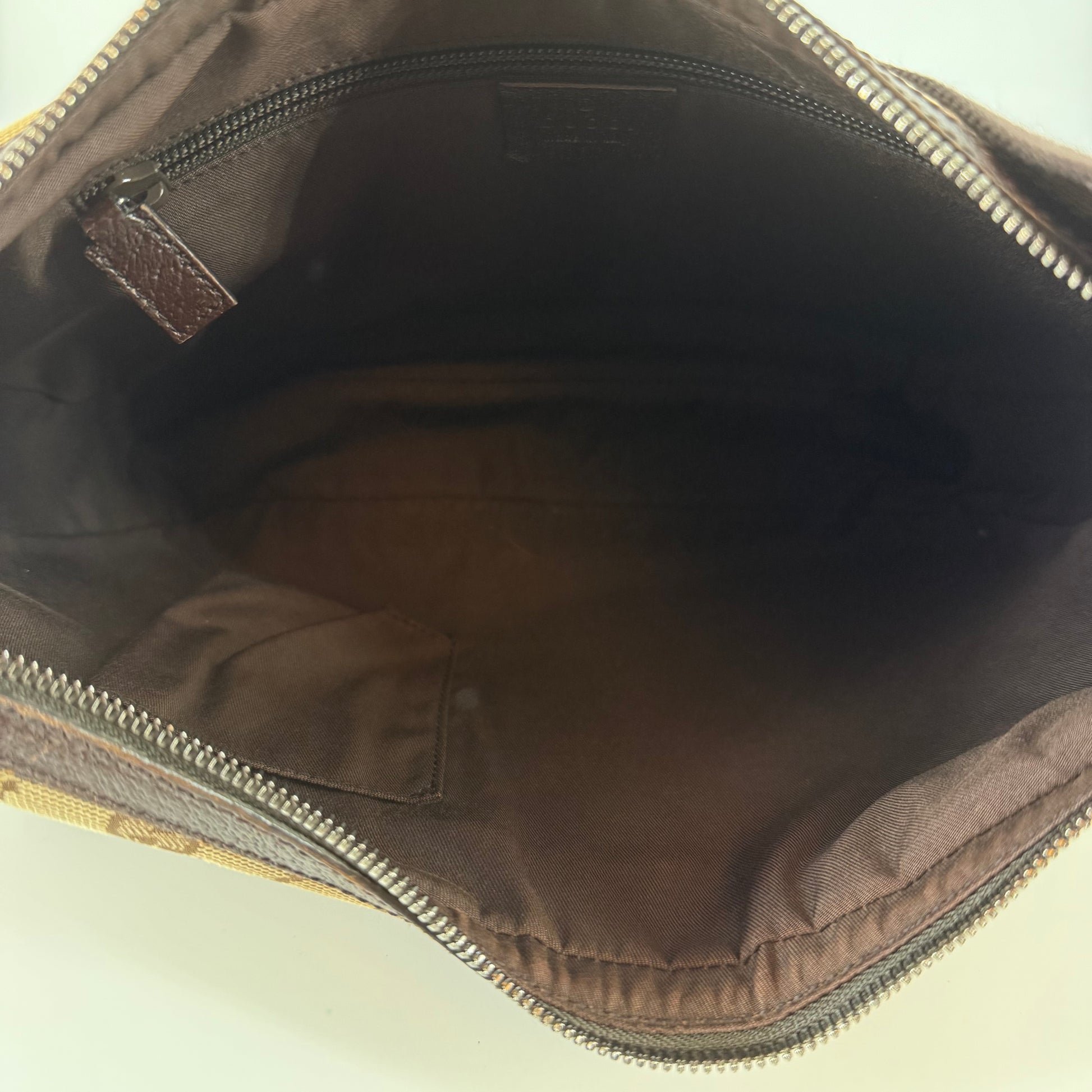 Exterior: Beige/brown GG canvas in good condition. No holes, no stains, no odors. The leather piping and trim around the edges and along the zipper show visible signs of wear and rubbing, and the leather has naturally patinated over the years.