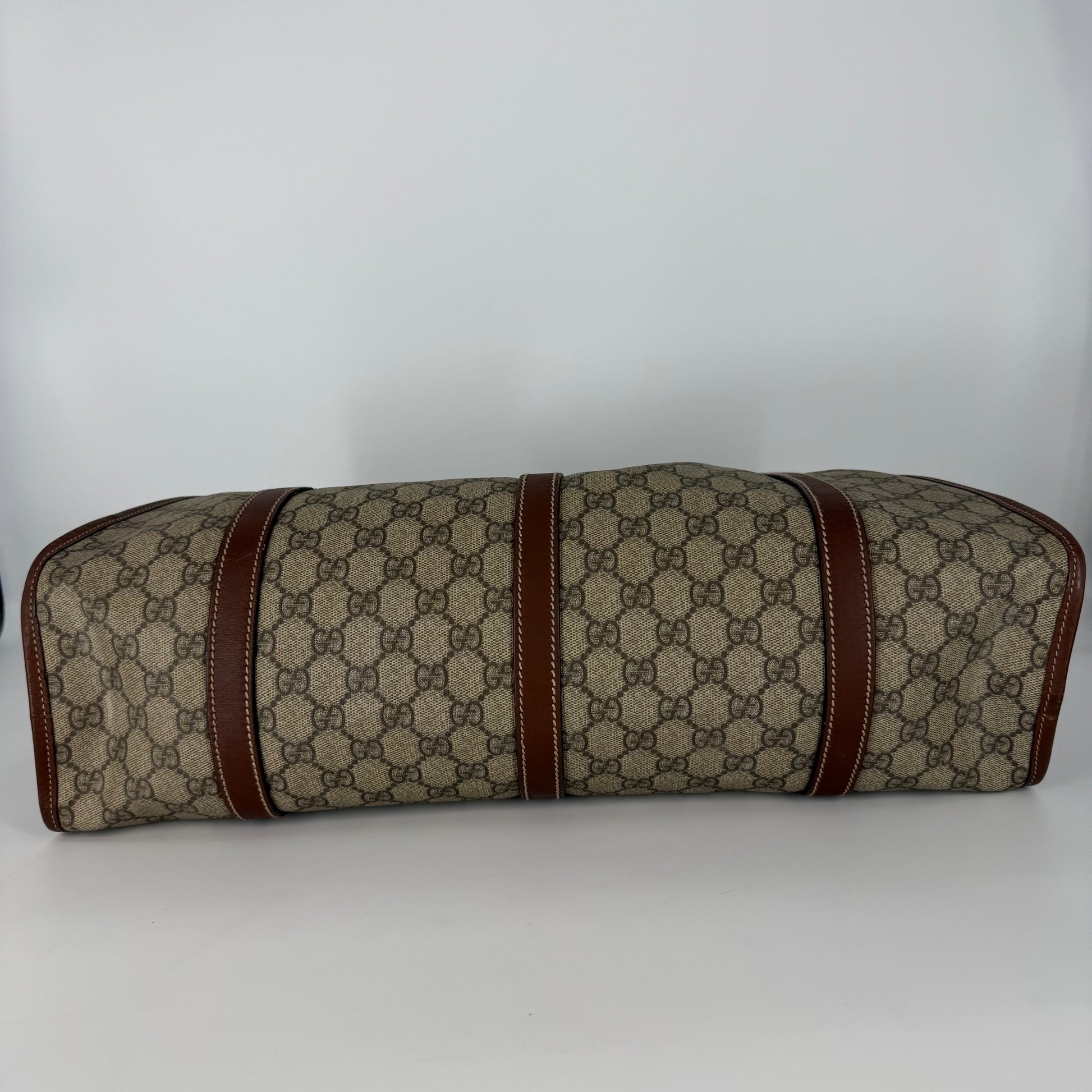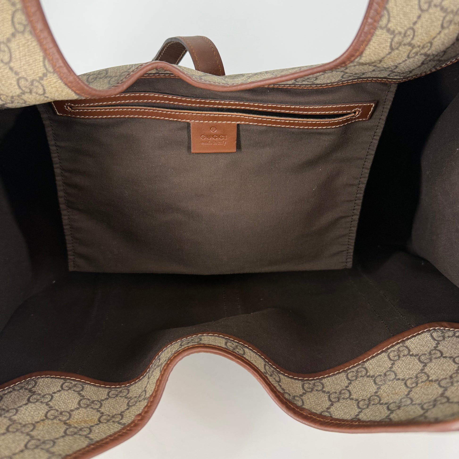 Exterior: Classic GG Supreme canvas with brown leather trim in good condition. No major stains, no tears. Corners show light surface wear consistent with age. Top handle and leather panels are fully functional with no damage.