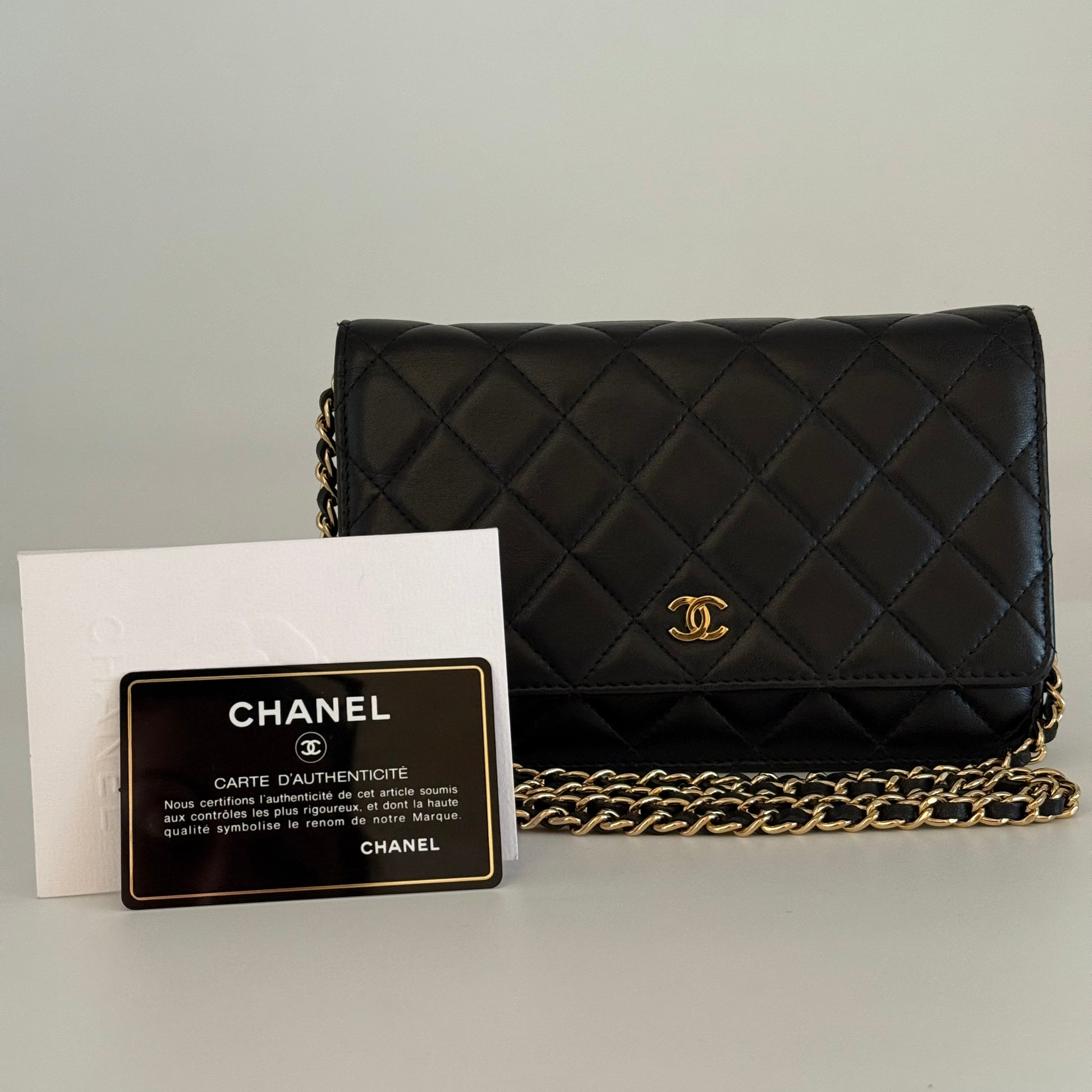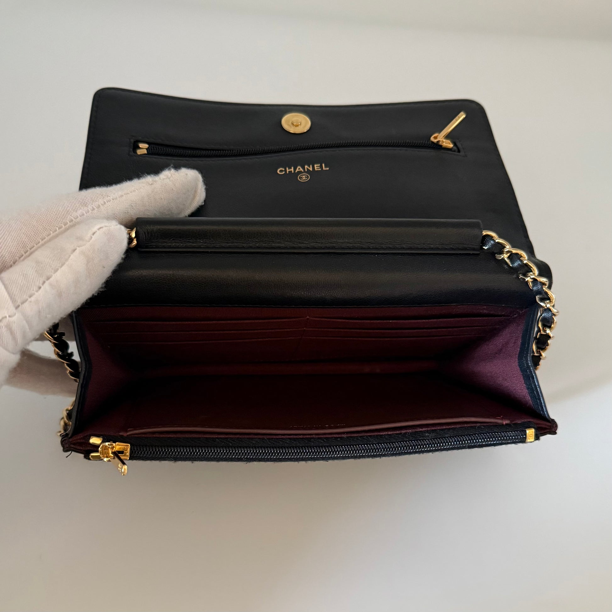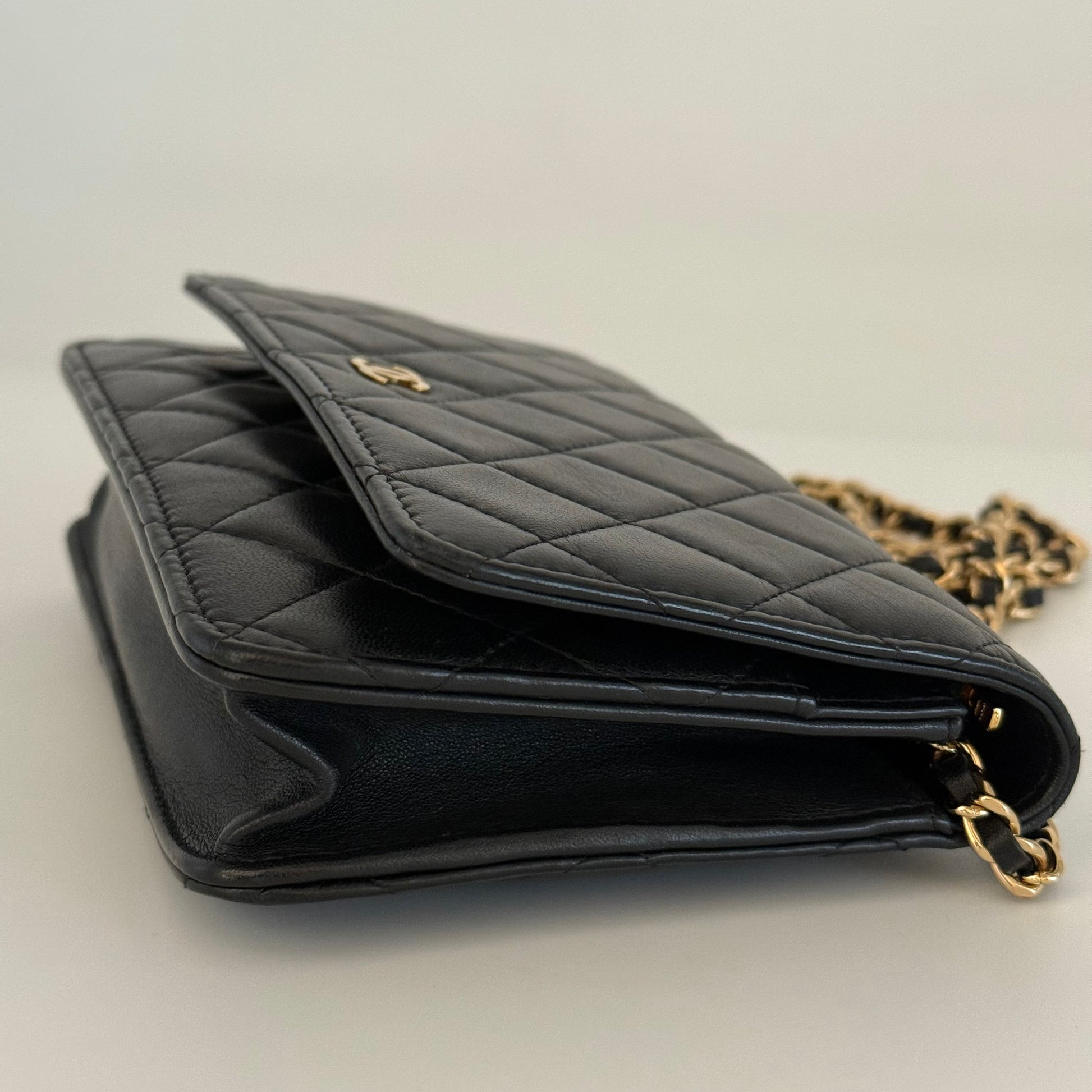 Exterior: Crafted in luxurious black lambskin, this iconic Chanel Wallet on Chain presents beautifully. The leather is soft and supple, clean with little to no visible signs of wear.
